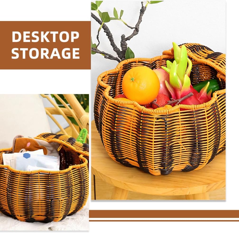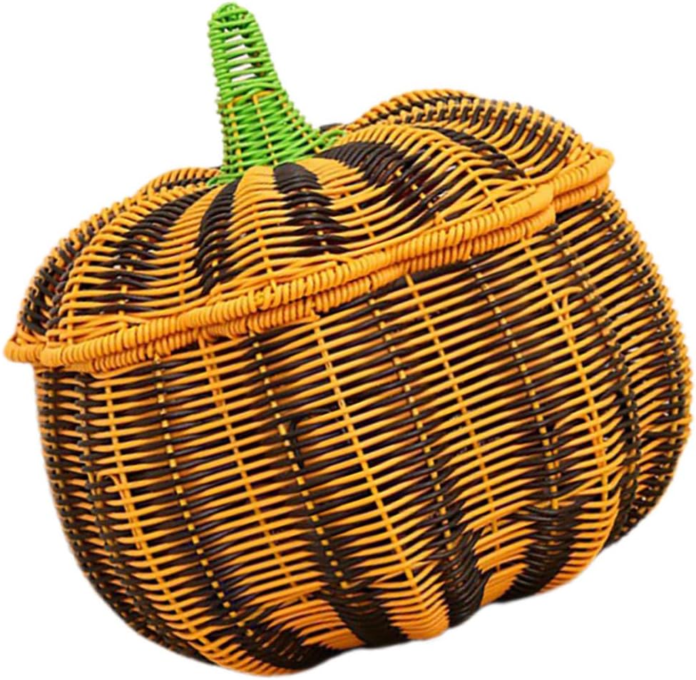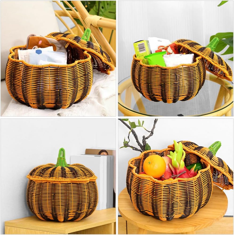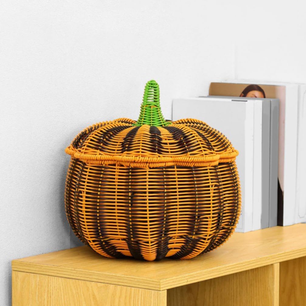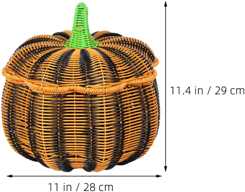 DescriptionPumpkin Shaped Rattan Box with Lid, Woven Wicker Candy Basket for Party Fruit Pastry Bread Snack Pastry Thanksgiving Fall Halloween DecorFeatures-Color:Multi-Material: PP-Size:29.00X28.00X28.00cmPackage Including1 x lidded storage basket