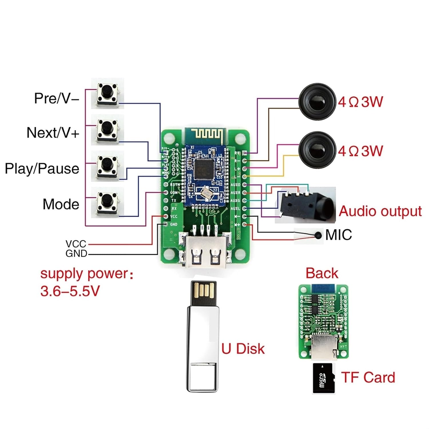 Sensor BlocksDescription:Power amplifier plate size: 2.9x4.3CMWith call, power on, maximum default volume, support AT instruction, see module BK3254 manual.5V power supply, maximum power drive dual 4O3WVCC and GND are power supply pins (3.6V-5.5V), L- and L+ are left speakers, R- and R+ are connected to the right speakers.COM is the common end of the button, and the other end of the button is P/V-, N/V+, PLAY and MODE respectively.AUXD, AUXL, AUXG, and AUXR are audio inputAUXD: audio input detection pin, input low level cut to audio input state.M+, M-: IMI head and negative poleSupport TF card, U disk, , input