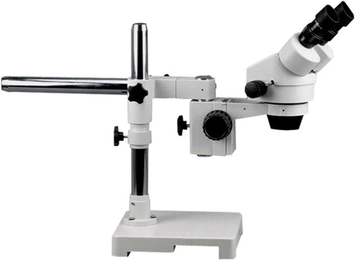 The AmScope SM-3B-FOR professional stereo zoom microscope has a pair of 10x super-widefield high-eyepoint eyepieces, a 0.7x-4.5x zoom objective, and a single-arm boom stand. The microscope has an overall magnification range of 7x-45x. The binocular viewing head has an interpupillary range of 55 to 75mm, a 45-degree inclination to reduce eye and neck strain, and 360-degree rotation to enable sharing. The WH10x20mm super-widefield high-eyepoint eyepieces combine with the 0.7x-4.5x zoom objective to provide continuous zoom magnification and a longer working distance for inspecting large-scale specimens that require handling or repair. High-eyepoint eyepieces ease viewing for users who wear glasses, and dioptric adjustment accommodates individual eye-strength differences. A stereo microscope, sometimes called an inspection or dissection microscope, has low magnification and a long working distance that enables users to manipulate the object being inspected. The fiber-optic ring light has a 150W/21V cool-light halogen light source for observing temperature-sensitive specimens. The ring light provides shadow-free illumination, and a rheostat controls the amount of light emanating from the lamp. The ring light has a 2-1/8" (56mm) inner diameter, a 3-1/8" (80mm) outer diameter, and a 35" (890mm) metal-sheathed light cable. Power and adjustment controls are located on a control box to speed adjustments. The light source has a forced-air cooling system to prevent overheating, and a built-in filter slot can be used to change the light color (filters sold separately). The top-mounted door eases access to the bulb, and automatically turns off the power supply when opened. The light uses a 110V power supply. The microscope has a 17" pillar that has an 8" vertical working distance. The 16" single-arm boom has a 24" overall length. Bilateral focus eases use for left- and right-handed users. The microscope head can be rotated on the X- and Y-axes. The solid cast-steel base is 1-3/4 x 9 x 9 inches (H x W x D, where H is height, the vertical distance from the lowest to highest point; W is width, the horizontal distance from left to right; D is depth, the horizontal distance from front to back).SpecificationsHeadBinocularMagnification range7x-45xZoom objective power0.7x-4.5xEyepieces (DIN, 30mm)WH10x20mm high-eyepointZoom range6.5:1Field of view1-1/4"Optical working distanceUp to 4"Microscope standSingle-arm boom standHead movementX- and Y-axesIllumination typeEpiscopic (reflected)Light sourceFiber-optic ring light, 150W/21V halogenPower110V-120VMicroscopes are instruments used to enhance the resolution of an object or image. Types include compound, stereo, or digital. Compound microscopes use a compound optical system with an objective lens and an eyepiece. Stereo microscopes show object depth in a three-dimensional image. Digital microscopes are used to display an image on a monitor, rather than looking through a lens. Microscopes can have monocular (one), binocular (two), or trinocular (three) eyepieces, with varying magnification abilities. Magnification ability refers to the size of an image. Resolution, also known as resolvant power, refers to the clarity of the image. The interaction between field of view (FOV), numerical aperture (NA), and working distance (WD) determines resolution. Microscopes can control magnification through a fixed focus, or through a range of adjustments. They can also utilize LED, fluorescent, and mirror light sources to help control viewing capabilities. Microscopes are widely used in education, lab research, biology, metallurgy, engineering, chemistry, manufacturing, and in the medical, forensic science, and veterinary industries.United Scope manufactures microscopy equipment and accessories under the brand name AmScope. The company, founded in 1996, is headquartered in Irvine, CA.What's in the Box?AmScope SM-3B-FOR stereo zoom microscope with single-arm boom standWH10x20mm eyepieces, 30mm, one pair0.7x-4.5x zoom objectiveFocus rackFiber-optic ring light (HL250-AR)Eye guards, one pairInstructions