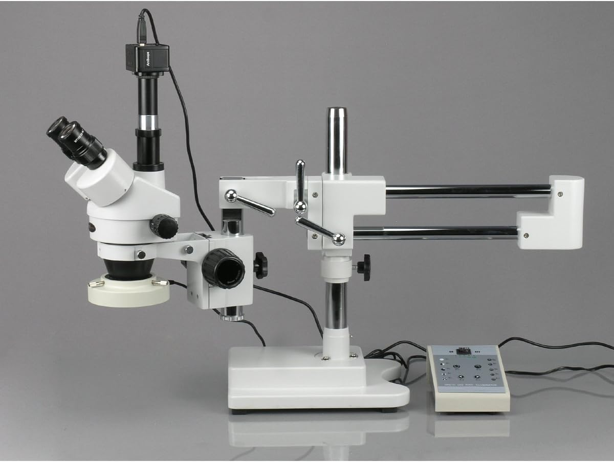 The AmScope SM-4TZ-80AM-5M digital professional trinocular stereo zoom microscope has a pair of 10x super-widefield high-eyepoint eyepieces, a 0.7x-4.5x zoom objective, two Barlow lenses, and a double-arm boom stand. The microscope has an overall magnification range of 3.5x-90x. The 5MP camera has a CMOS color sensor, a reduction lens, image capture and editing software, and USB 2.0 output to capture or display still or video images on a computer or projector. The trinocular viewing head has an interpupillary range of 55 to 75mm, a 45-degree inclination to reduce eye and neck strain, and 360-degree rotation to enable sharing. The vertical trinocular port can be used as a C-Mount or 23mm photo port. The WH10x20mm super-widefield high-eyepoint eyepieces combine with the 0.7x-4.5x zoom objective to provide continuous zoom magnification and a longer working distance for inspecting large-scale specimens that require handling or repair. The microscope comes with 0.5x and 2.0x Barlow lenses that can be added to the objective to increase the magnification range. A Barlow lens with a magnification of less than 1.0 reduces magnification and increases the working distance, while a Barlow lens with a magnification greater than 1.0 increases the magnification and reduces the working distance. High-eyepoint eyepieces ease viewing for users who wear glasses, and dioptric adjustment accommodates individual eye-strength differences. A digital stereo microscope, sometimes called an inspection or dissection microscope, has low magnification and a long working distance that enables users to manipulate the object being inspected, and is used where image capture, detailed records, or documentation is required. The 5MP digital camera has a CMOS color sensor for displaying still microscopy images and streaming live videos to a computer or projector. The camera has 40x magnification and a 0.5x reduction lens that ensures that the display has a similar field of view as the microscope eyepiece. The camera can be mounted in a C-Mount or any 23mm eye tube. The camera includes image capture and editing software that provides still image and live video capture and editing capability, including measurement functions. The software supports JPG, TIF, GIF, PSD, WMF, and BMP file formats and is compatible with Windows XP, Vista, 7, and 8; Mac OS X; and Linux. Camera drivers are compatible with Windows XP, Vista, 7, and 8; Mac OS X; and Linux. The software includes Windows APIs for native C/C++, C#, DirectShow, Twain, and LabVIEW that enable custom application development. The camera has a USB 2.0 data port (cable included).The removable 80-bulb LED ring light has eight separate zones to independently control light intensity and direction, and five programmable memories to remember settings for quick access across tasks. The ring light provides bright, cool light for working with temperature-sensitive or live specimens, and shadow-free illumination. A rheostat controls the amount of light emanating from the lamp. Power and adjustment controls are located on a control box to speed adjustments. The ring has a 2-5/8" (66mm) inside diameter and a 4-3/8" (110mm) outside diameter. The light has an optimum working range of 2-3/8 to 5-1/2" (60 to 140mm). It has a 100,000-hour life span and a 110V-240V variable power supply. The microscope has a double-arm boom stand that enables users to position the microscope head on all three axes (X, Y, and Z). Bilateral focus eases use for left- and right-handed users. The stand has 20" double arms, and a 30" overall length. The pillar is 17" and the focus rack has a 3" diameter. The solid cast-steel base is 2 x 8-1/4 x 10-1/4 inches (H x W x D, where H is height, the vertical distance from the lowest to highest point; W is width, the horizontal distance from left to right; D is depth, the horizontal distance from front to back).Microscope SpecificationsHeadTrinocularMagnification range3.5x-90xZoom objective power0.7x-4.5xEyepieces (DIN, 30mm)WH10x20mm high-eyepointTrinocular portC-Mount or 23mmField of view2-1/2"Optical working distanceUp to 8"Microscope standDouble-arm boom standHead movementX-, Y-, and Z-axesIllumination typeEpiscopic (reflected)Light sourceEight-zone LED ring lightPower110V-240VCamera SpecificationsResolution5MP (2592 x 1944 effective pixels)Image typeStill image and video display and captureCamera typeBrightfieldCamera sensor1/2.5" Aptina MT9P001 CMOS (color)Magnification40xReduction lens0.5xMounting size23mm or C-MountFrame rate60fps at 640x480; 18fps at 1280x960; 5fps at 2592x1944Computer connectionUSB 2.0 (backward compatible on PCs only)File formatsJPG, TIF, GIF, PSD, WMF, BMPSoftware packageImage capture and editing for Windows XP, Vista, 7, and 8; Mac OS X; and LinuxCamera driver compatibilityWindows XP, Vista, 7, and 8; Mac OS X; and LinuxMicroscopes are instruments used to enhance the resolution of an object or image. Types include compound, stereo, or digital. Compound microscopes use a compound optical system with an objective lens and an eyepiece. Stereo microscopes show object depth in a three-dimensional image. Digital microscopes are used to display an image on a monitor, rather than looking through a lens. Microscopes can have monocular (one), binocular (two), or trinocular (three) eyepieces, with varying magnification abilities. Magnification ability refers to the size of an image. Resolution, also known as resolvant power, refers to the clarity of the image. The interaction between field of view (FOV), numerical aperture (NA), and working distance (WD) determines resolution. Microscopes can control magnification through a fixed focus, or through a range of adjustments. They can also utilize LED, fluorescent, and mirror light sources to help control viewing capabilities. Microscopes are widely used in education, lab research, biology, metallurgy, engineering, chemistry, manufacturing, and in the medical, forensic science, and veterinary industries.United S