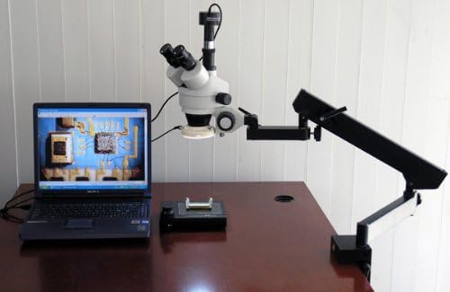 The AmScope SM-6TZ-80S-8M digital professional trinocular stereo zoom microscope has a pair of 10x super-widefield high-eyepoint eyepieces, a 0.7x-4.5x zoom objective, two Barlow lenses, and a clamping articulating arm stand. The microscope has an overall magnification range of 3.5x-90x. The 8MP camera has a CMOS color sensor, a reduction lens, image capture and editing software, and USB 2.0 output to capture or display still or video images on a computer or projector. The trinocular viewing head has an interpupillary range of 55 to 75mm, a 45-degree inclination to reduce eye and neck strain, and 360-degree rotation to enable sharing. The vertical trinocular port can be used as a C-Mount or 23mm photo port. The WH10x20mm super-widefield high-eyepoint eyepieces combine with the 0.7x-4.5x zoom objective to provide continuous zoom magnification and a longer working distance for inspecting large-scale specimens that require handling or repair. The microscope comes with 0.5x and 2.0x Barlow lenses that can be added to the objective to increase the magnification range. A Barlow lens with a magnification of less than 1.0 reduces magnification and increases the working distance, while a Barlow lens with a magnification greater than 1.0 increases the magnification and reduces the working distance. High-eyepoint eyepieces ease viewing for users who wear glasses, and dioptric adjustment accommodates individual eye-strength differences. A digital stereo microscope, sometimes called an inspection or dissection microscope, has low magnification and a long working distance that enables users to manipulate the object being inspected, and is used where image capture, detailed records, or documentation is required. The 8MP digital camera has a CMOS color sensor for displaying still microscopy images and streaming live videos to a computer or projector. The camera has 40x magnification and a 0.5x reduction lens that ensures that the display has a similar field of view as the microscope eyepiece. The camera can be mounted in a C-Mount or any 23mm eye tube. The camera includes image capture and editing software that provides still image and live video capture and editing capability, including measurement functions. The software supports JPG, TIF, GIF, PSD, WMF, and BMP file formats and is compatible with Windows XP, Vista, 7, and 8; Mac OS X; and Linux. Camera drivers are compatible with Windows XP, Vista, 7, and 8; Mac OS X; and Linux. The software includes Windows APIs for native C/C++, C#, DirectShow, Twain, and LabVIEW that enable custom application development. The camera has a USB 2.0 data port (cable included).The removable 80-bulb LED ring light provides bright, cool light for working with temperature-sensitive or live specimens. The ring light provides shadow-free illumination, and a rheostat controls the amount of light emanating from the lamp. Power and adjustment controls are located on the light head. The light has a 100,000-hour life span and a 90V-265V variable power supply. The stand has an articulating arm with a 40" reach for covering a large work space, and a clamp for attaching the microscope to a work surface. The stand can be attached to ledges up to 2-1/8" (53mm) thick. Microscope SpecificationsHeadTrinocularMagnification range3.5x-90xZoom objective power0.7x-4.5xEyepieces (DIN, 30mm)WH10x20mm high-eyepointTrinocular portC-Mount or 23mmField of view2-1/2"Vertical working distanceUp to 8"Microscope standClamping articulating armHead movementX-, Y-, and Z-axesIllumination typeEpiscopic (reflected)Light source80-bulb LED ring lightPower90V-265VCamera SpecificationsResolution8MP (3264 x 2448 effective pixels)Image typeStill image and video display and captureCamera typeBrightfieldCamera sensor1/2.5" Aptina Special CMOS (color)Magnification40xReduction lens0.5xMounting size23mm or C-MountFrame rate27fps at 800x600; 8fps at 1600x1200; 1.9fps at 3264x2448Computer connectionUSB 2.0 (backward compatible on PCs only)File formatsJPG, TIF, GIF, PSD, WMF, BMPSoftware packageImage capture and editing for Windows XP, Vista, 7, and 8; Mac OS X; and LinuxCamera driver compatibilityWindows XP, Vista, 7, and 8; Mac OS X; and LinuxMicroscopes are instruments used to enhance the resolution of an object or image. Types include compound, stereo, or digital. Compound microscopes use a compound optical system with an objective lens and an eyepiece. Stereo microscopes show object depth in a three-dimensional image. Digital microscopes are used to display an image on a monitor, rather than looking through a lens. Microscopes can have monocular (one), binocular (two), or trinocular (three) eyepieces, with varying magnification abilities. Magnification ability refers to the size of an image. Resolution, also known as resolvant power, refers to the clarity of the image. The interaction between field of view (FOV), numerical aperture (NA), and working distance (WD) determines resolution. Microscopes can control magnification through a fixed focus, or through a range of adjustments. They can also utilize LED, fluorescent, and mirror light sources to help control viewing capabilities. Microscopes are widely used in education, lab research, biology, metallurgy, engineering, chemistry, manufacturing, and in the medical, forensic science, and veterinary industries.United Scope manufactures microscopy equipment and accessories under the brand name AmScope. The company, founded in 1996, is headquartered in Irvine, CA.What's in the Box?AmScope SM-6TZ-80S-8M stereo zoom microscope with clamping articulating arm standWH10x20mm eyepieces, 30mm, one pair0.7x-4.5x zoom objective0.5x Barlow lens2.0x Barlow lens80-bulb LED ring light (LED-80S)Focus rack8MP digital camera (MU800)0.5x reduction lensUSB 2.0 cableSoftware CDEye guards, one pairInstructions