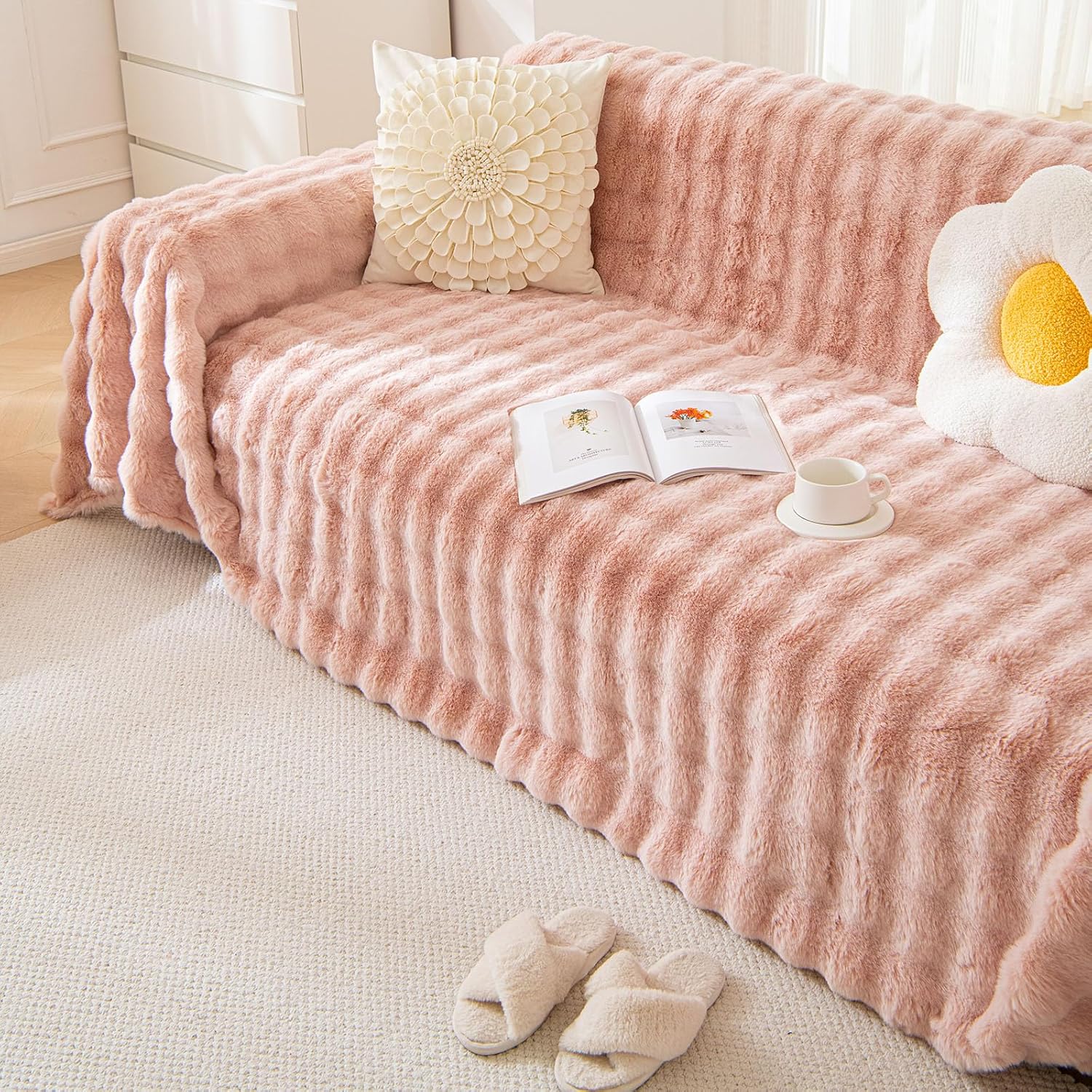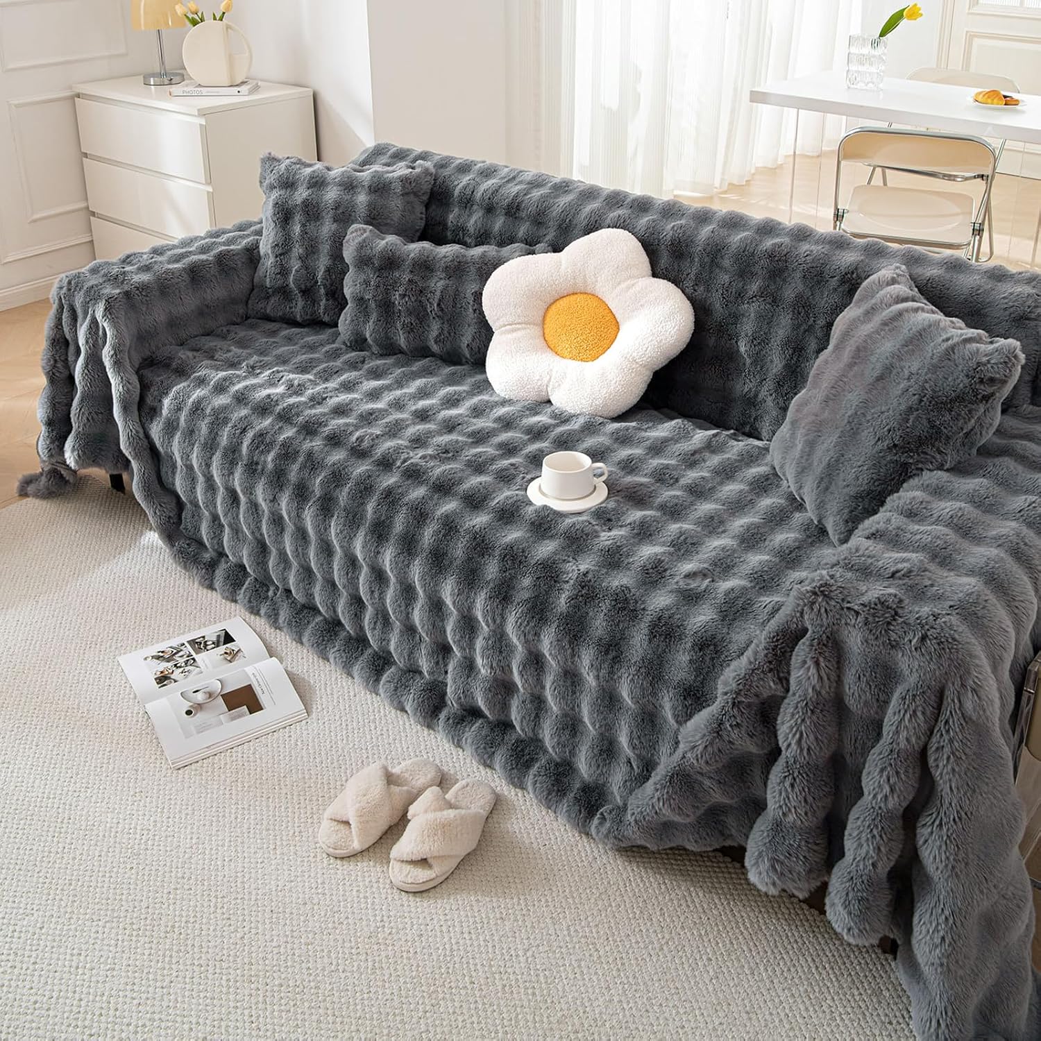 The faux fur couch cover is a decorative and functional piece designed to enhance the appearance and comfort of your couch. Made from synthetic fur, it offers a luxurious and cozy look while providing added warmth and protection for your furniture. The cover is easy to install, typically slipping over the existing couch cushions or frame, and can be removed for cleaning and storage. Its soft texture and neutral color palette make it a versatile addition to any living room or seating area.