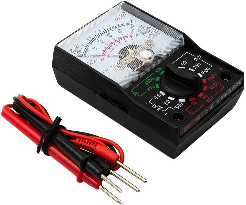 Features: Made of - materials, for Mini multimeter, an excellent instrument for electronic engineersHas excellent mechanical strength and high electrical insulation levelUsed in factories, miners, schools, homes and electrical maintenanceEspecially suitable for e-learning courses and radio experimentsProduct parameters:Model: -110ADC voltage range: 0-10-50-250-1000VAC voltage range: 0-10-50-250-1000VDC current range: 0-0.5-50-500mAOhmmeter: x10, x100, x1KDecibel: -20dB to +22dB on the AC voltage rangePower supply: 1 * AA battery (not included)Size (length * width * height): 8.8 * 6.0 * 2.5cm / 3.5 * 2.4 * 1.0 inchesThe package includes:1 * 110A AC/DC analog multimeter (not including battery)2 *Test pen