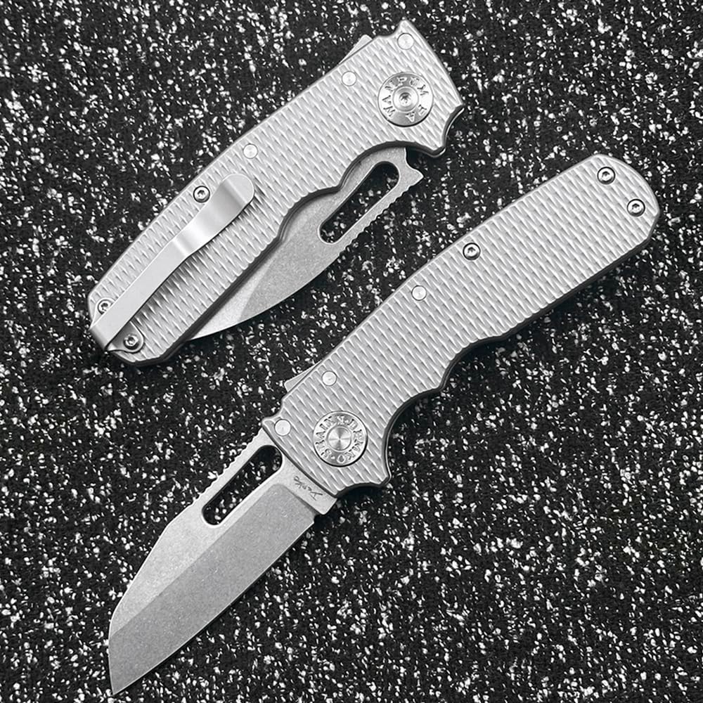 Total length: 175mm Blade length: 69mm Actual work cutting edge:Sheepsfoot 63mm / Drop 64mm Handle length: 107mm Blade thickness: 2.2mm Handle thickness:about 9.3mm Blade width:24mm Blade material: 9Cr14MoV Mark S35VN Logo Blade Finished: Stone washed Handle material: Titanium alloy Hardness: 58-59 HRC System: ceramic ball bearings Knife Weight: 100-102g Packing:box
