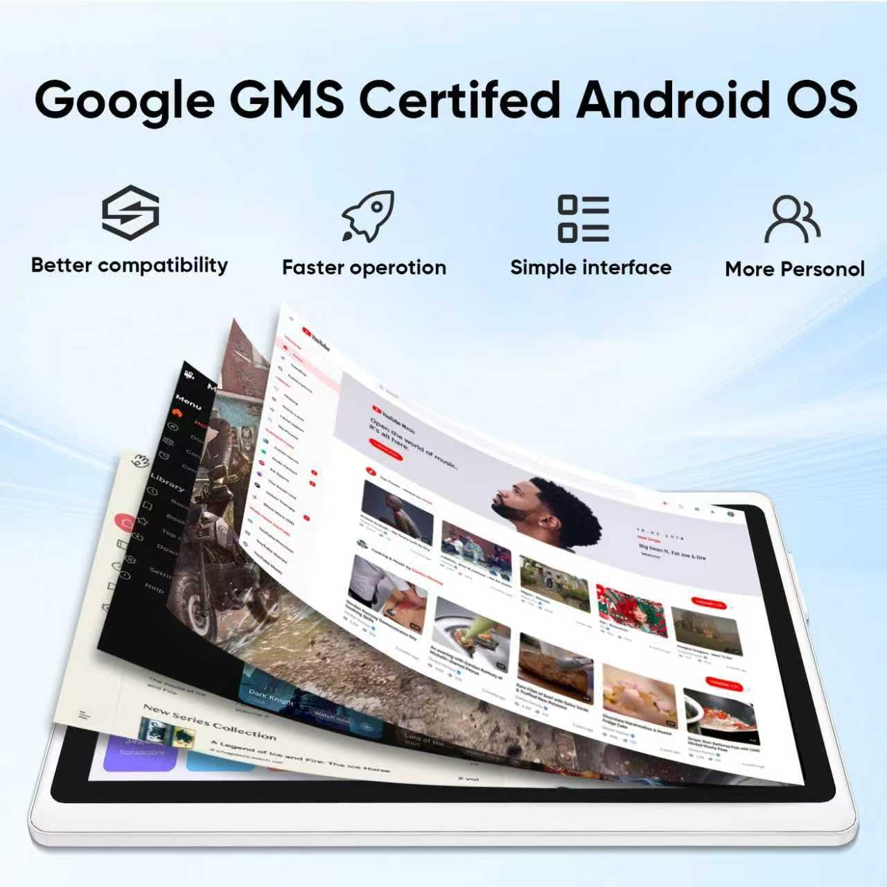• 【Android Tablet】Equipped with the latest Android system, it has stronger compatibility, faster response speed and smoother operation. It is GMS certified, pre-installed with Google Play, and supports social applications such as Facebook, Twitter, YouTube, and TikTok. It is very suitable for watching videos, online chatting, reading e-books, etc.