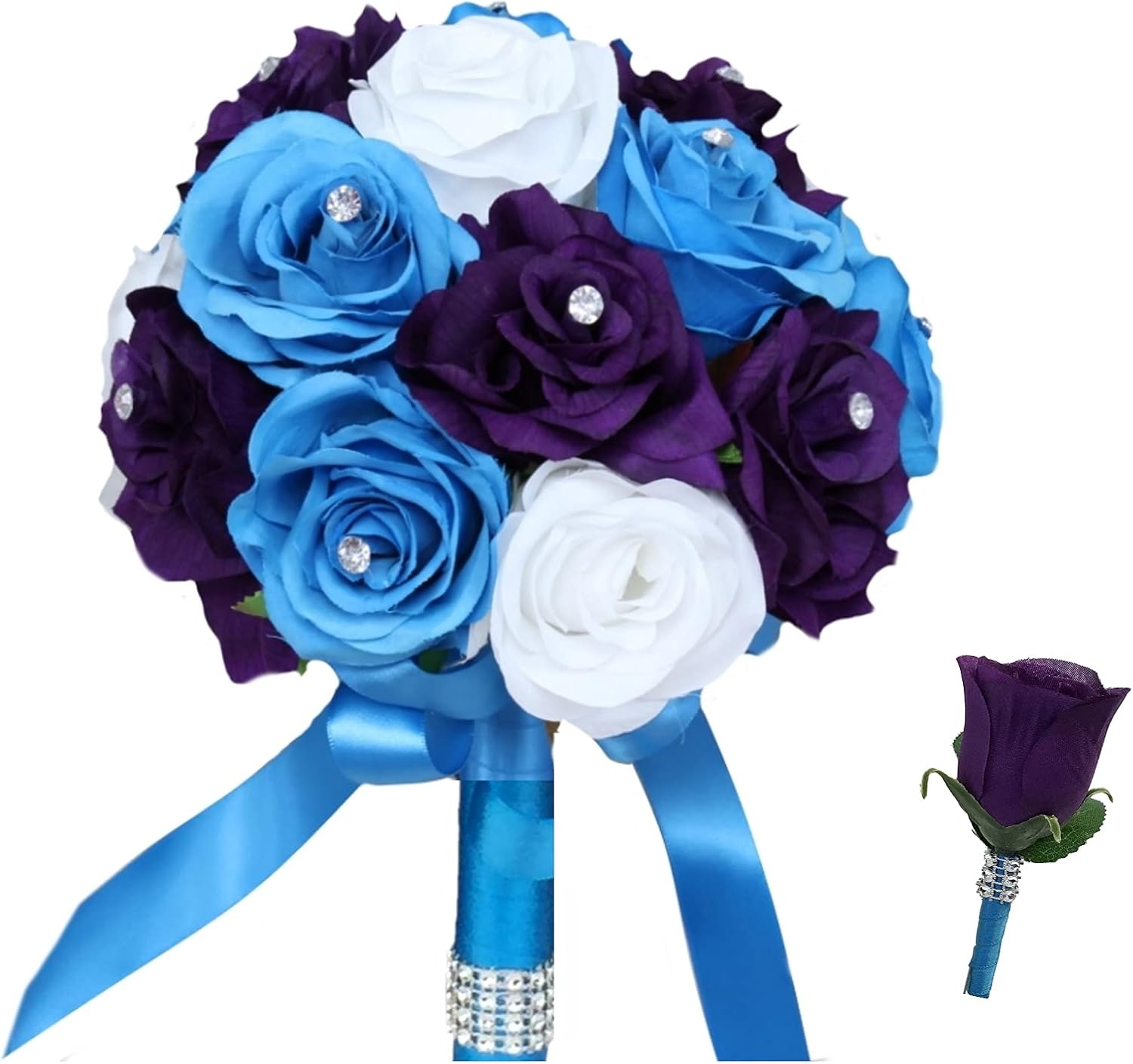 Bouquet measures at 8 inch in diameter. Boutonniere measures at 2" x 5"H.
