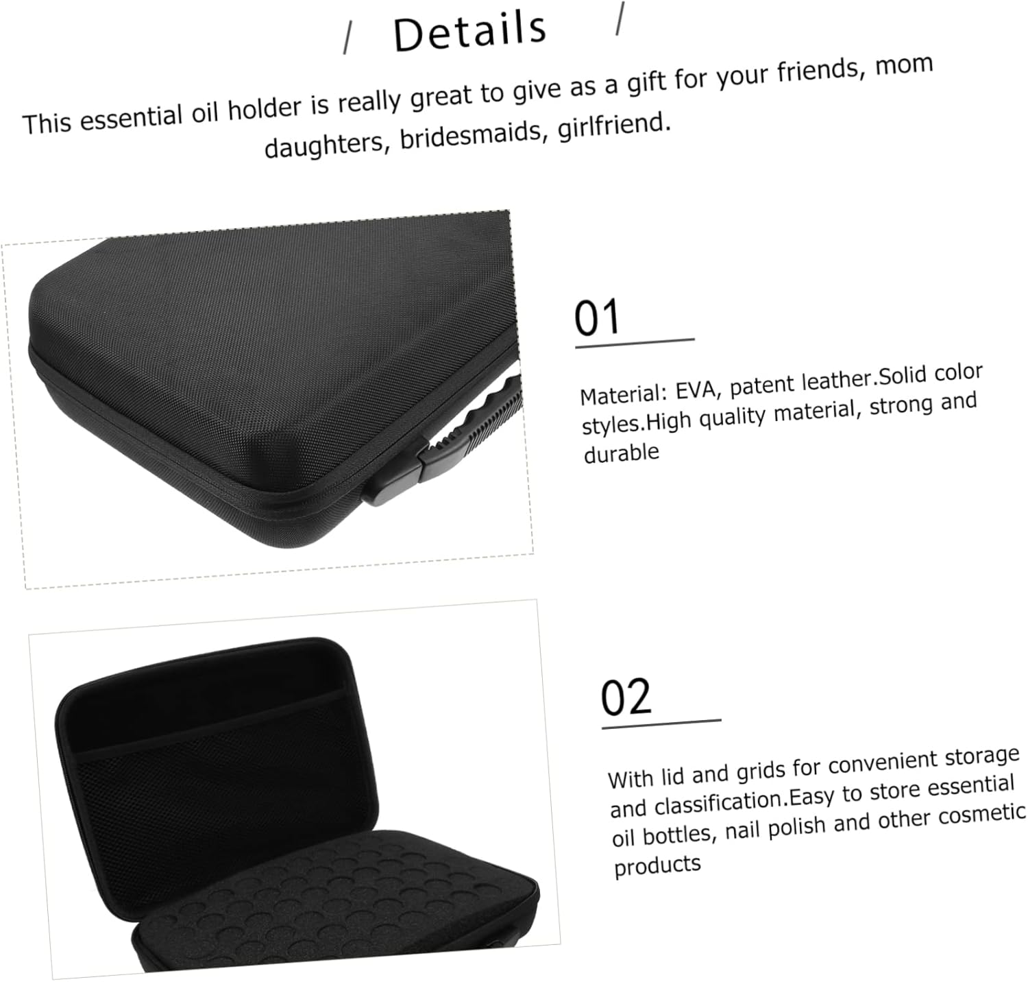 Package List 1 x essential oil storage pouch Characteristics -Material: EVA, patent leather Essential Oils Travel Case -Size: 31.00X20.00X9.00cm/12.18X7.86X3 Essential Oil Storage Bag. - for hold bottled essential oils or roller bottles, solid construction and easy to carry, choice for travel Essential Oil Storage Case. - It is a wonderful for anyone who love to collect essential oils Essential Oil Travel Case. - It is also convenient for putting into your luggage for outdoor use Essential Oil Carrying Box. - Keeping your essential oil bottles safe, sturdy and protected from sunlight, making them neat and travel-friendly Essential Oil Bottle Organizer. Travel Storage Pouch - Nice choice for Valentine's Day, Christmas, Mother's Day, Birthday etc Essential Oil Bottle Holder.Goods DescriptionEssential Oil Holder It can protect your essential oil bottles well.Essential Oil Storage Bag You can easily put it in your luggage for traveling.Essential Oil Pouch Smooth zipper pull to make opening and closing your case a cinch.Essential Oil Travel Case It is for keeping essential oil bottles and other cosmetics accessories