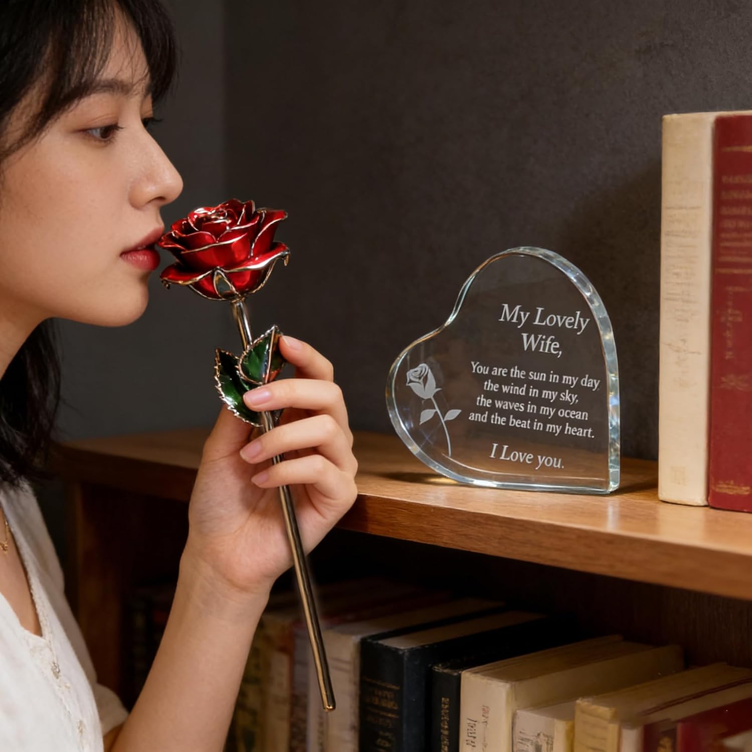 | Included Components | Elegant Wooden Presentation Box, 24K Gold Dipped Preserved Rose, Metal Rose Display Stand, Engraved Crystal Heart |
