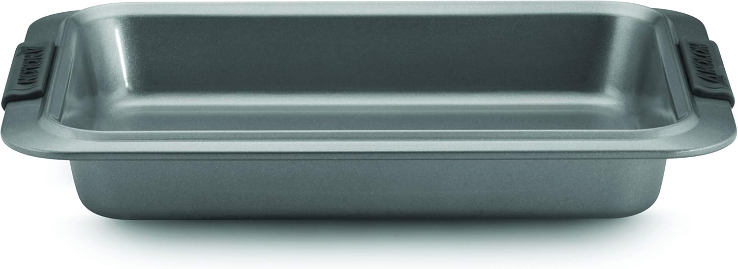 Treat everyone to delicious baked goods, brightly decorated party cakes, and more with the Anolon Advanced Nonstick Bakeware 9-Inch x 13-Inch Cake Pan with Silicone Grips and Lid. This versatile rectangular cake pan is the go-to pan for baking birthday cakes or even main courses for breakfast, lunch and dinner, and measures up to the high standards of serious home bakers. The pan includes a sturdy, clear plastic lid snaps on to help protect the textures and flavors. Constructed of heavy gauge steel in a medium color tone that aids in even browning, this cake pan resists warping and provides the even heat distribution essential for successful baking. The durable nonstick surface provides optimum food release, and its wide rim and handles fitted with silicone grips provide more confident hold and a comfortable grasp even with bulky oven mitts. This bakeware is oven safe to 450°F (except the lid), as well as the perfect compliment to the rest of the Anolon Advanced collections. Take desserts, baked treats, and main courses and sides on the go baked and transported with the Anolon Advanced Nonstick Bakeware 9-Inch x 13-Inch Cake Pan with Silicone Grips with Lid.