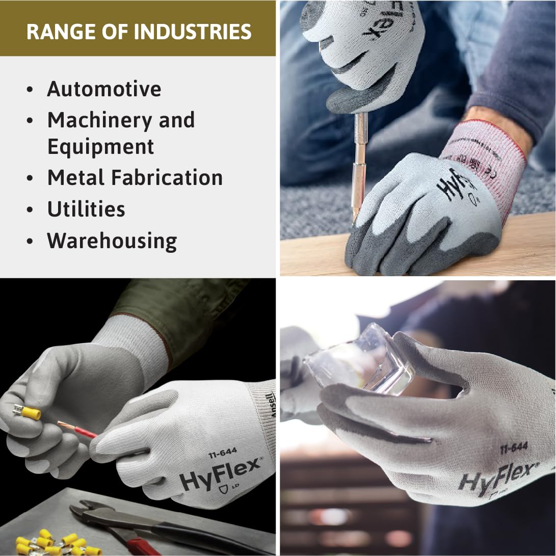 Our mechanical HyFlex 11-644 work gloves feature an abrasion-resistant polyurethane coating to make the gloves both maneuverable and hard-wearing over time. The versatile gloves have an ergonomic fit and low palm weight making them comfortable for highly precise operations in industries like automotive, machinery and equipment, metal fabrication, utilities, and warehousing. These mechanical gloves use Intercept Cut Resistance Technology to ensure workplace safety and are EN ISO B/ANSI A2 laceration resistant. Available sizes: XXS (5), XS (6), S (7), M (8), L (9), XL (10), XXL (11), XXXL (12). Gauge: 13. Applications: Press shop operations, handling metal sheets and panels, handling parts with sharp, rough edges, inspection (picking, checking and marking), and cutting glasses, sheets, panels.