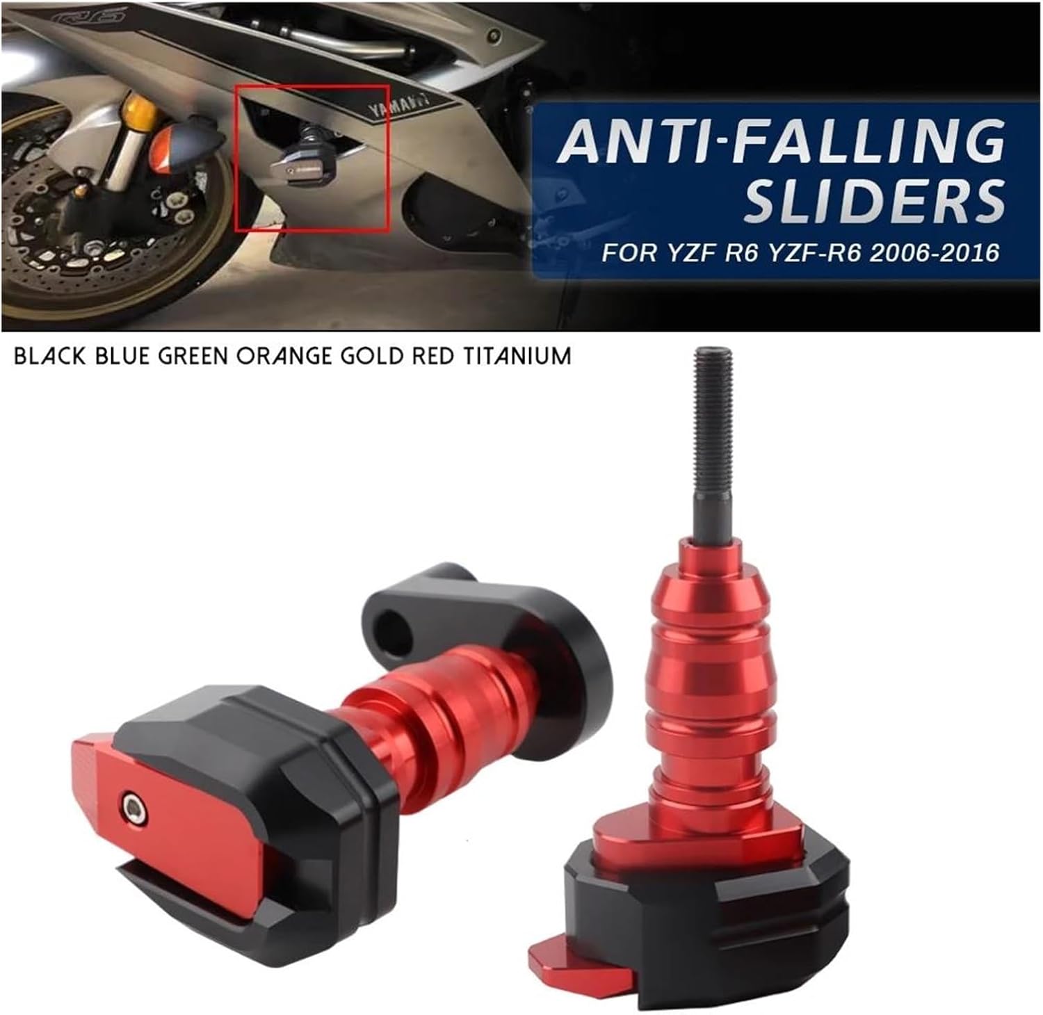 FeaturesDesigned to minimize damage to bicycle frames, engines, shells and fairings in the unfortunate event of a fall.Minimize damage to bicycle frames, engines, shells and fairings in the unfortunate event of a fallHigh torsion and stress resistant crash pads.CNC machined installation, anodized surface treatment.Easy to install, no modification required for installation. Comes with mounting hardware.Product DetailsMaterial: Nylon + AluminumColor: BlackPosition on Vehicle: Front (Right and Left)Type: Frame Slider Crash Pad ProtectorFitmentFit for Yamaha YZF-R6 2006-2016Note: (Please make sure this part fits your motorcycle before ordering)Package Included:1 pair of frame slider guards (as shown in the picture)