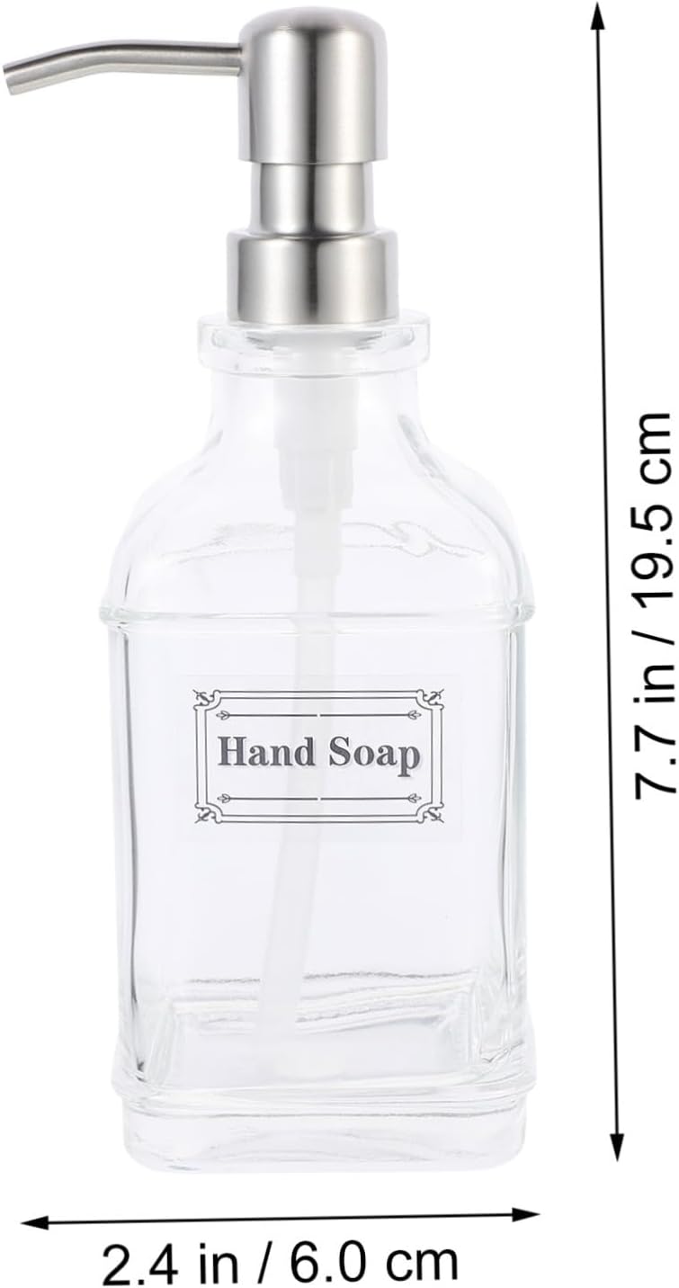 Package Include 1 x Dispenser Bottle (with sticker) Characteristics -Product Info:Soap dispenser - Size: 19.50X6.00X6.00cm/7.66X2.36X2.36in pump bottle. - Material: Glass, stainless steel lotion dispenser. - Capacity: 300ml bottles. - and sturdy base design glass soap dispenser, equipped with the latest anti-rust pump, made of stainless steel. Provides brightness lotion bottles. - It is very suitable for filling your favorite hand soap, dish soap, lotion, essential oil, shampoo. Or fill with gems as a modern and practical decoration empty lotion bottles. - Reusable, and portable. Easy and convenient to use. Fashion and simple design will also decor your toilet or bathroom conditioner bottles. - The attractive clear soap dispenser will decorate any bathroom, kitchen, office and other spaces. body wash pump bottle - The streamlined bottle is a gentle square, rounded corners, and a clear glass soap dispenser shows when it needs to be refilled empty pump bottles for lotion.Goods DescriptionTransparent Storage Bottles Made of safe and stainless steel and glass material for long term use.lotion dispenser pump bottle This item is a pump bottle for liquid storage.toiletry bottles Fine craft and delicate design make it suitable for cosmetic liquid storage and leakproof, suitable for daily household and outdoor travel use