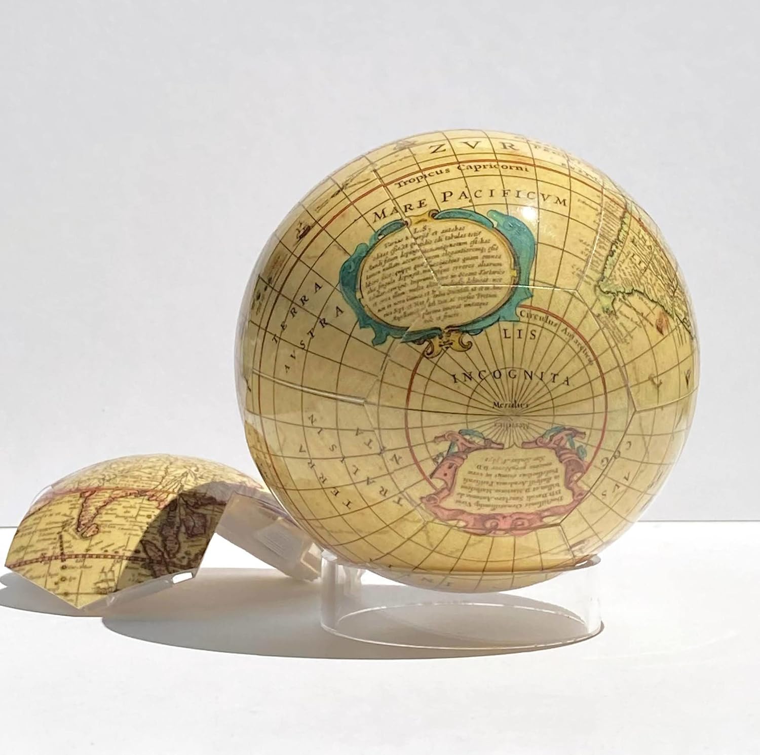 Snapspheres 4-inch (100 mm) 16 piece globe is projected from the world map found in the Mercator-Hondius Atlas of 1630. The map was created by Dutch cartographer Henricus Hondius who included the latest information brought back by global explorers of the time. We brought the map into the modern age by printing it on pieces with high detail and photo quality gloss. The pieces come together with the snap of rare earth magnets. Assemble as a puzzle, or follow the guide numbers on the back of each piece. Includes an attractive acrylic display stand and a pouch to store the pieces when not on display.