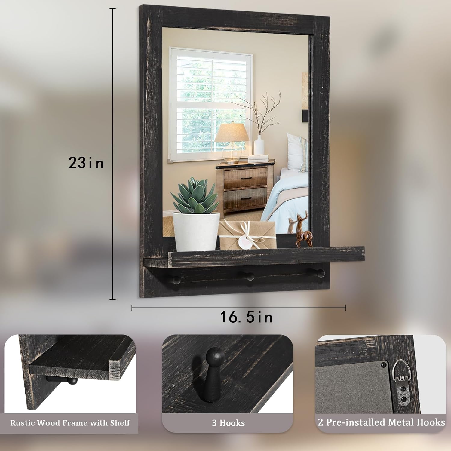 Practical and Beautiful Wall Decor The wall mirror shelf with its traditional rustic style wood frame,add the special charm and warm feel to your home. And the wood mirror with shelf will easily help you to arrange and store your necessaries in your daily life. Add a Sense of Light and Space Using a wood shelf mirror in any wall of your place is not only for makeup but also a good way to increase the sensation of light and space,makes your room look more spacious,bright and comfortable. Perfect Gift Farmhouse Bathroom Mirror is beautiful,exquisite and practical,and help you to arrange and store your daily necessaries,our mirror shelf is an ideal addition for almost any home decor. Therefore,this rustic mirror will be a perfect gift for birthday,wedding,housewarming,Thanksgiving or Christmas for friends,colleagues and relatives. Tips Due to the different textures of the wood material,the actural wood framed mirror may be slightly different from the pictures.