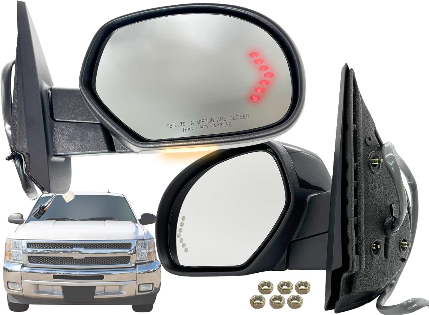 Item Description: Aftermarket OEM Replacement of Exterior Rear View Mirror Assembly Passenger Right RH and Driver Left LH Sides for Left-Hand Drive (LHD) Car Convex and Flat Glasss Power Adjustment on Glass With Heated / Defrost / Defogger Function 7-Dot LED Turn Signal Lamp on Glass , Red Light Puddle / Courtesy Lamp Included , White Lens with Amber Light Memory / Curb Assist / Curb View Assist / Curb Assistance Function Included Chrome Upper Mirror Cover Power Folding Type No Blind Spot Detection / BSD / BLIS Function Included No Auto Dimmer / Auto Dim / Auto Dimming Function Included No Hardware Included Standard Non-Towing Mirror Made in Taiwan Manufactured in IATF 16949 / ISO 9001 certified facilities Disclaimer: This product is designed for use exclusively with vehicles that were originally manufactured with the corresponding factory-installed features. Compatibility is not guaranteed for vehicles that have been modified or do not include these features from the factory. We recommend that installation be done by professionals, as item will not come with installation instructions and we do not provide any installation/troubleshooting assistance. Fits OEM Part Numbers: 25776084 , 25831064 Fits Partslink Numbers: GM1321499 , GM1320499 Fits Model and Year: 2007 2008 07 08 CHEVY AVALANCHE 2009 2010 2011 2012 2013 09 10 11 12 13 CHEVY SILVERADO 1500 / 2500 HD / 3500 HD & HYBRID 2009 2010 2011 2012 2013 09 10 11 12 13 GMC SIERRA 1500 / 2500HD / 3500HD & HYBRID 2009 2010 2011 2012 2013 09 10 11 12 13 CHEVY TAHOE 2009 2010 2011 2012 2013 09 10 11 12 13 CHEVY SUBURBAN 2009 2010 2011 2012 2013 09 10 11 12 13 GMC YUKON / DENALI / XL NOTICE of Installation Manual for Power Folding Mirror: To avoid any manual folding action, tight three screws with balance torque. DO NOT tight individual one and then the other, while you are installing the mirror up on your door panel. After installation is done, please RUN the power folding function at least TWICE to the let the mirror fold back to its original position. Please re-set and re-program the memory function of the mirror glass. **Please Note** The mirror will also fit 2009 - 2014 models. The difference is the signal light design on the glass. Other than that, the plugs and fitment is still the same.