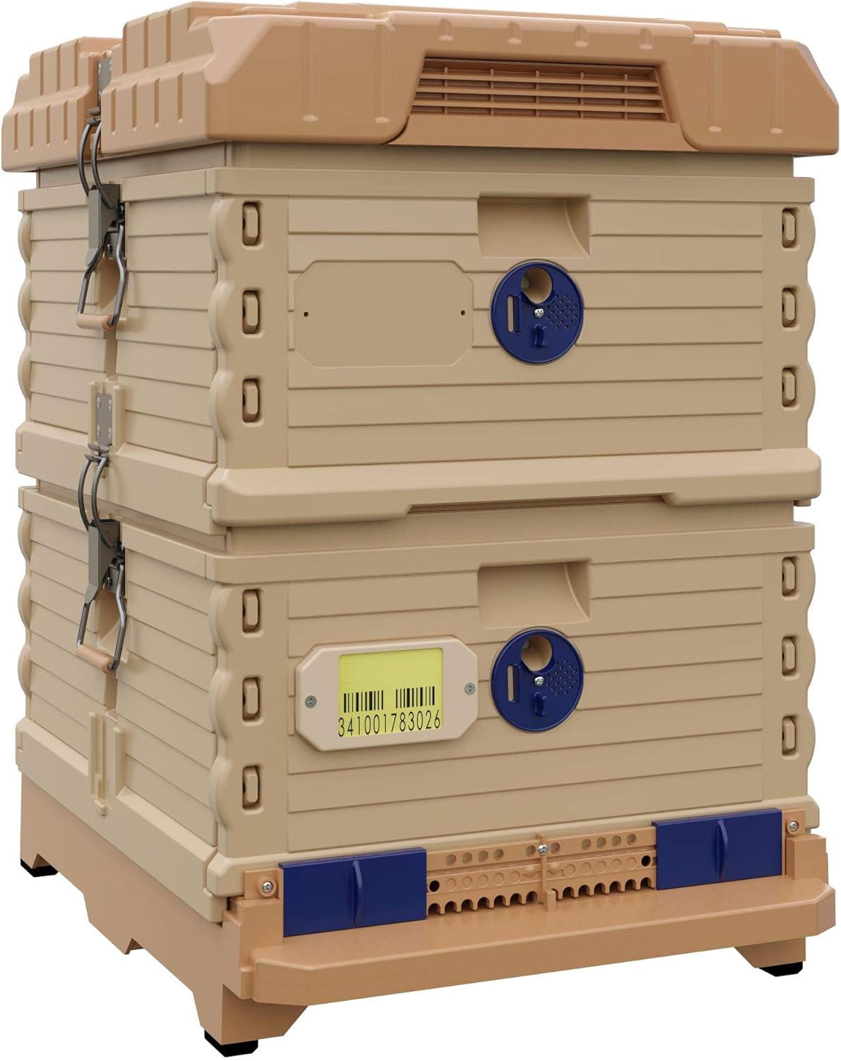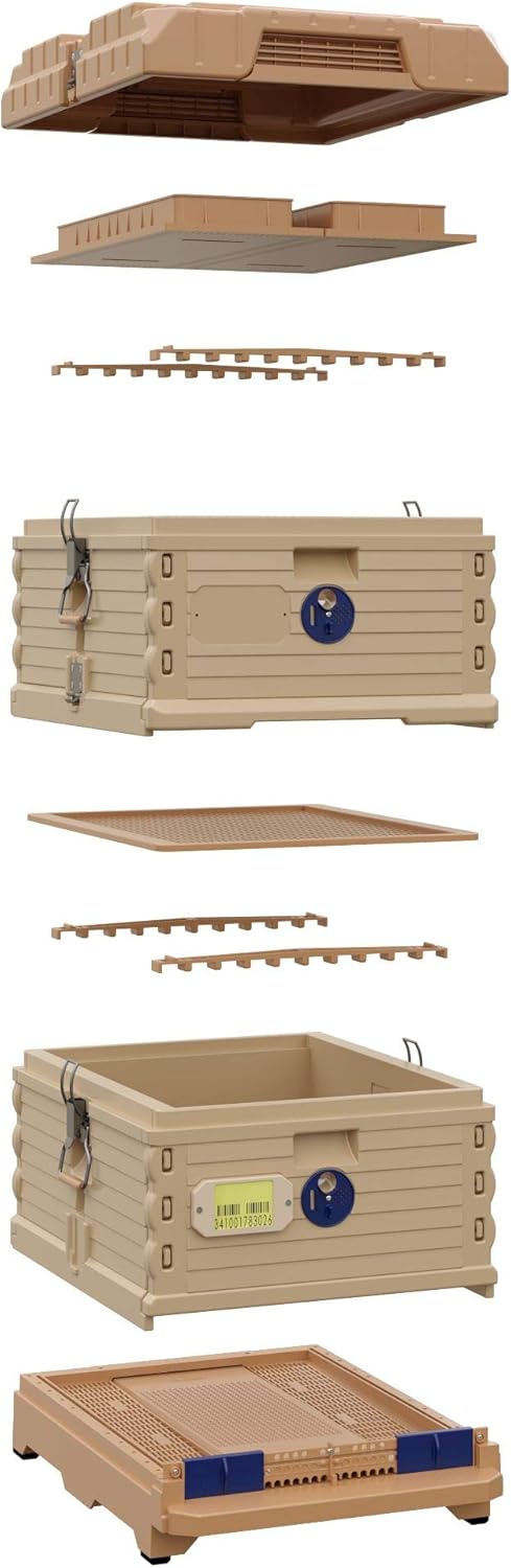 Apimaye insulated bee hives are made from food grade, UV-resistant plastic (HDPE) with anti-static additives. Double layer insulation helps keeping the colony warmer in the winter and cooler in the summer. It does not absorb moisture, and active ventilation system resists fungus growth which is a common problem in wooden hives. It reduces the winter food consumption, and stimulates colony growth in the spring therefore it is more productive. It is a standard Langstroth hive and wooden or plastic frames can be used interchangeably. Standard features from bottom to top: Screened bottom board with pollen trap and drawer: Enables collecting your fresh local pollen. The pollen collected by the bees gets trapped and falls on the bottom drawer. The pollen can then be collected by just pulling the drawer from the back. The screened bottom board helps fighting Varroa mites and small hive beetle. The entrance reducer can help prevent looting, and enables locking the front for winter. The hive bottom board also has ventilation slots to fight moisture buildup inside the hive. Multi functional slot: Located on the brood boxes and the supers, the slot can be adjusted to be used for ventilation, bee entrance or queen entrance for the mating flight. Division/uniting board: The specially designed board can be inserted to divide a colony, or unite two colonies into a single hive. Queen excluder: Specially designed queen excluder that allows space between the frames so bees can move more freely. Frame spacers: Helps stabilizing the frames the hive. Located on top of the frames , they prevent frame shifting while carrying in hives with less than 10 frames Side latches and handles: Used to secure the broodbox, super or the hive top cover to each other and easy handling and carrying. Top Cover Feeder: Used to easily feed the bees with candy or syrup without opening the hive and disturb the hive balance. Features mechanism to prevent bees from drowning in the syrup.