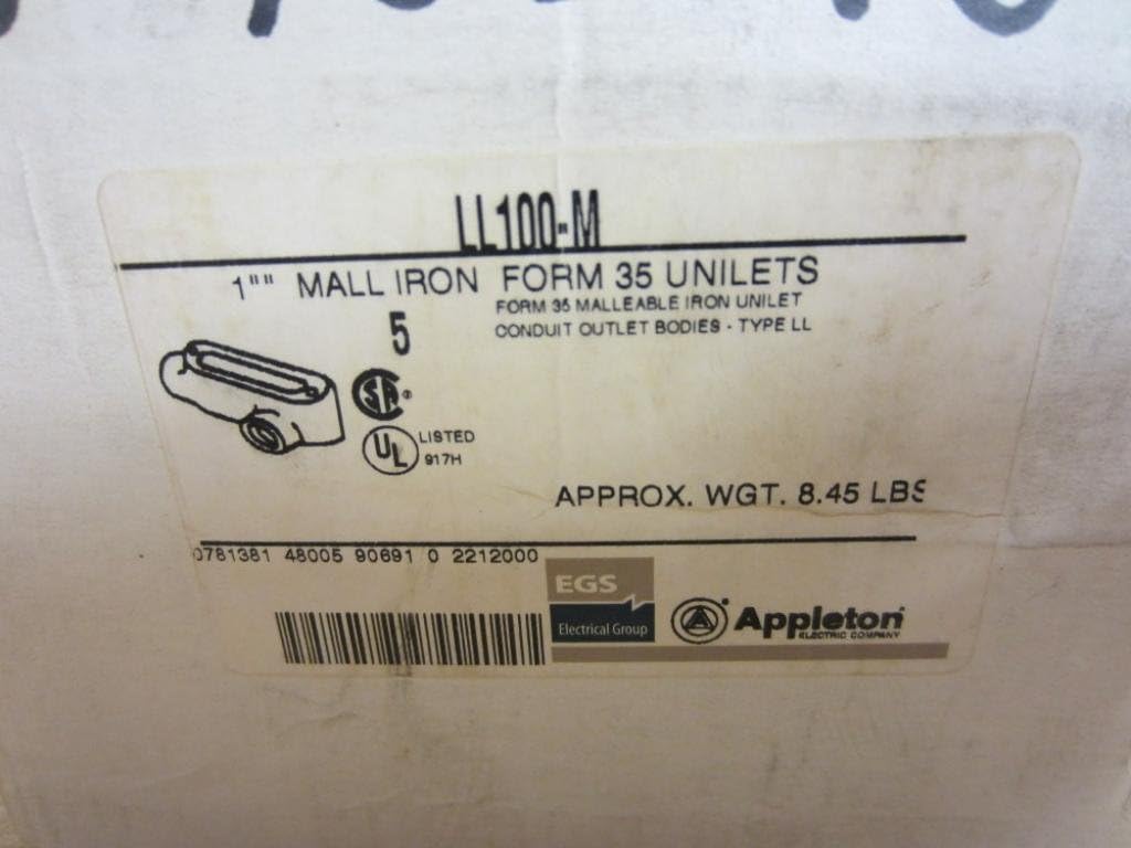 PN: LL100-M LL100M Appleton EGS Electrical Group PN: LL100-M LL100M LL100 M Conduit Outlet Body Size: 1" Mall Iron Form 35 Unilets Type LL Volume: 12.5 CU IN 0781381 48005 90691 0 2212000 Cross Reference Manufacturer | Part Number Crouse-Hinds | LL100-M O-Z/Gedney | LL100