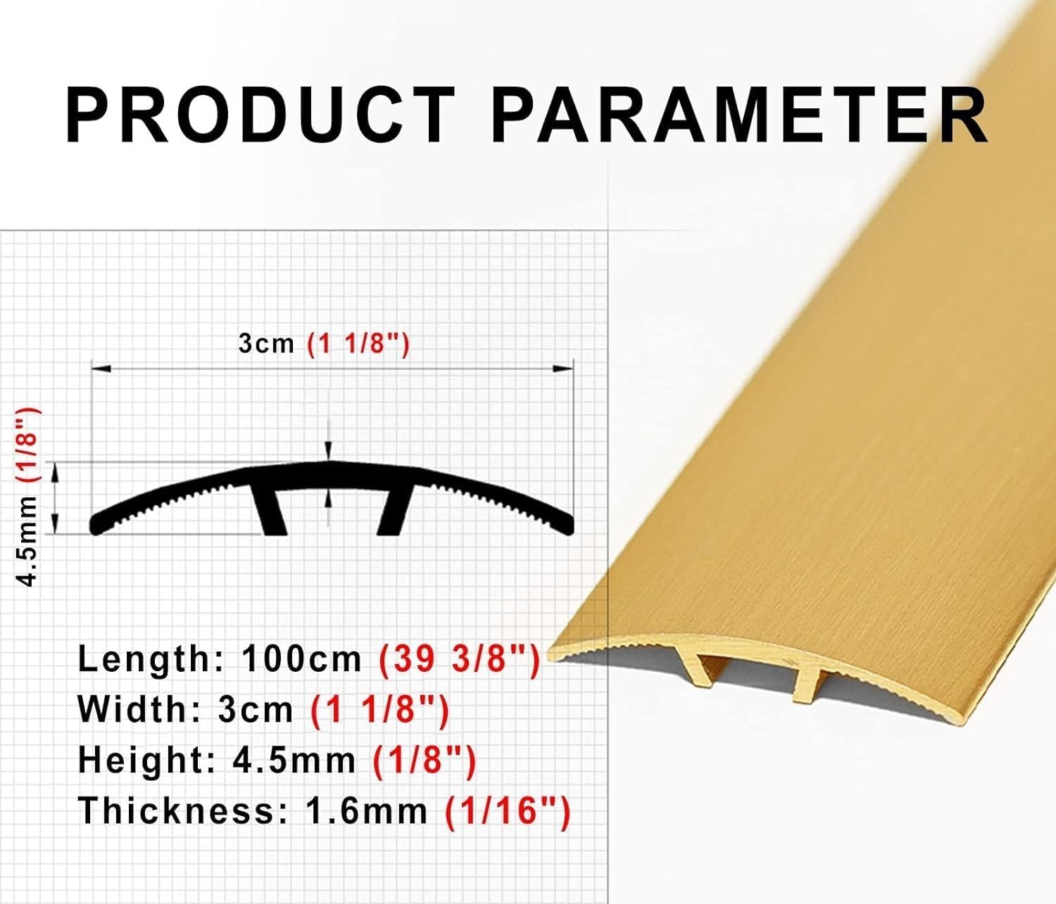 Floor transition strips made of brass cover the seams or gaps between two floor surfaces and protect the edges of the floor, suitable for the transition between wood flooring and carpet, wood flooring and tile, carpet and tile, wood flooring and laminate flooring. Helpful to protect children or the elderly, not easy to trip, make your home beautiful and safe.◆ Specifications:- Material: brass Brass- Size: 100 cm (39.3/8 inches) Length: 100 cm (39 3/8 inches), Width: 3 cm (1 1/8 inches), Height: 4.5 mm (1/8 inches), Thickness: 1.6 mm (1/16 inches)- Cuttable◆ Packing list:- 1 x Floor transition strip◆ Features - Brass material floor transition strip- No nails/screws required, just glue for installation- Not easy to trip over- Decorative trim- Withstands high foot traffic- Wheelchair-accessible◆ Attention:- Due to manual measurement, there may be an error of 1-3 cm.- Color difference may exist due to the difference between the recording light and the display. Please refer to the actual product.◆ Quality Service:- Please feel free to contact us when you encounter any problems while using our products, we will try our best to solve them for you. If you leave a message in the comment or feedback and we can't find and solve it in time, you can tell us through message. Thanks!