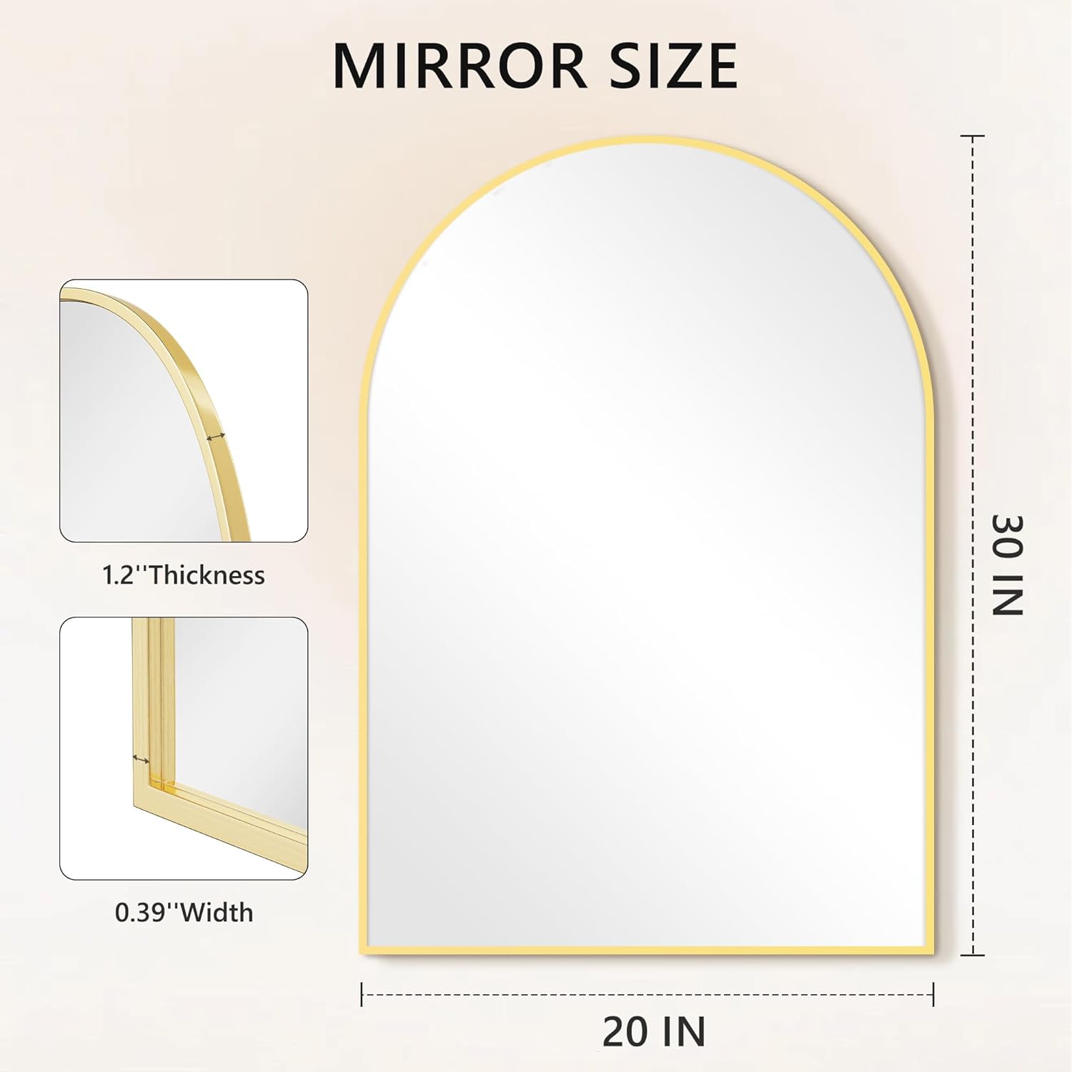 ★Specification:Mirror Size: 24"*36,20"*30",26"*38" ★Mirror types:wall mounted mirror/Arch Mirror/leaning mirror/hang mirror/wall mirror/makeup mirror/body mirror/ dressing mirror/standing mirror/decorative mirror/vanity mirror ★Color:Black/gold ★Style:morden,classic Installation:Wall-Mounted,hanging,leaning against wall ★ Glass material:Shatterproof HD glass★ Mirror material:glass,Aluminum ★ Room types:bedroom,living room,dressing room,hall way,apartment,home gym,closet,yoga room ★Care note:the mirror is made of dust-proof,if you want to clean it,you can use small cloth to wipe the glass surface.