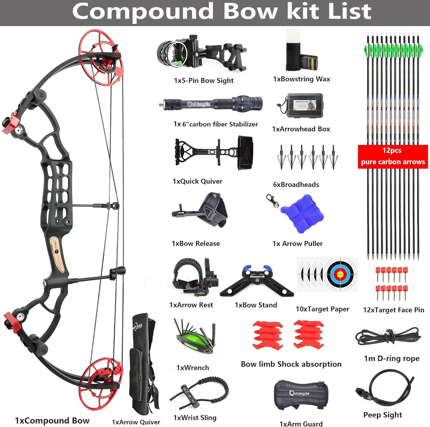 Axle-to-Axle: 31" IBO Arrow Speed: 340FPS Draw Weight: 45-60 Lbs / 55-70Lbs Draw length: 25"-30"(adjustable ) Brace Height: 6.8" Let-off: 80% Bow weight: 4.09Lbs (1854g) Bow handle :Die Casting Process Bow limbs: American Gordon Bow Limb Wheelset : 7075 Aluminum CNC Machined The package includes: 1xCompound Bow 1x5-Pin Bow Sight 1x 6"carbon fiber Stabilizer 1xQuick Disconnect Quiver 1xBow Release 1xArrow Rest 1x Multifunctional Wrench 1xBow Wrist Sling 1xBowstring Wax 1xArrowhead Box 6xHunting Broadheads 1x Arrow Puller 10xTarget Paper 1xBow Stand 1xArm Guard 12xCarbon Arrow 12xTarget Face Pin 1m D-ring rope 1xPeep Sight 1xArrow Quiver2xBow limb body shock absorption