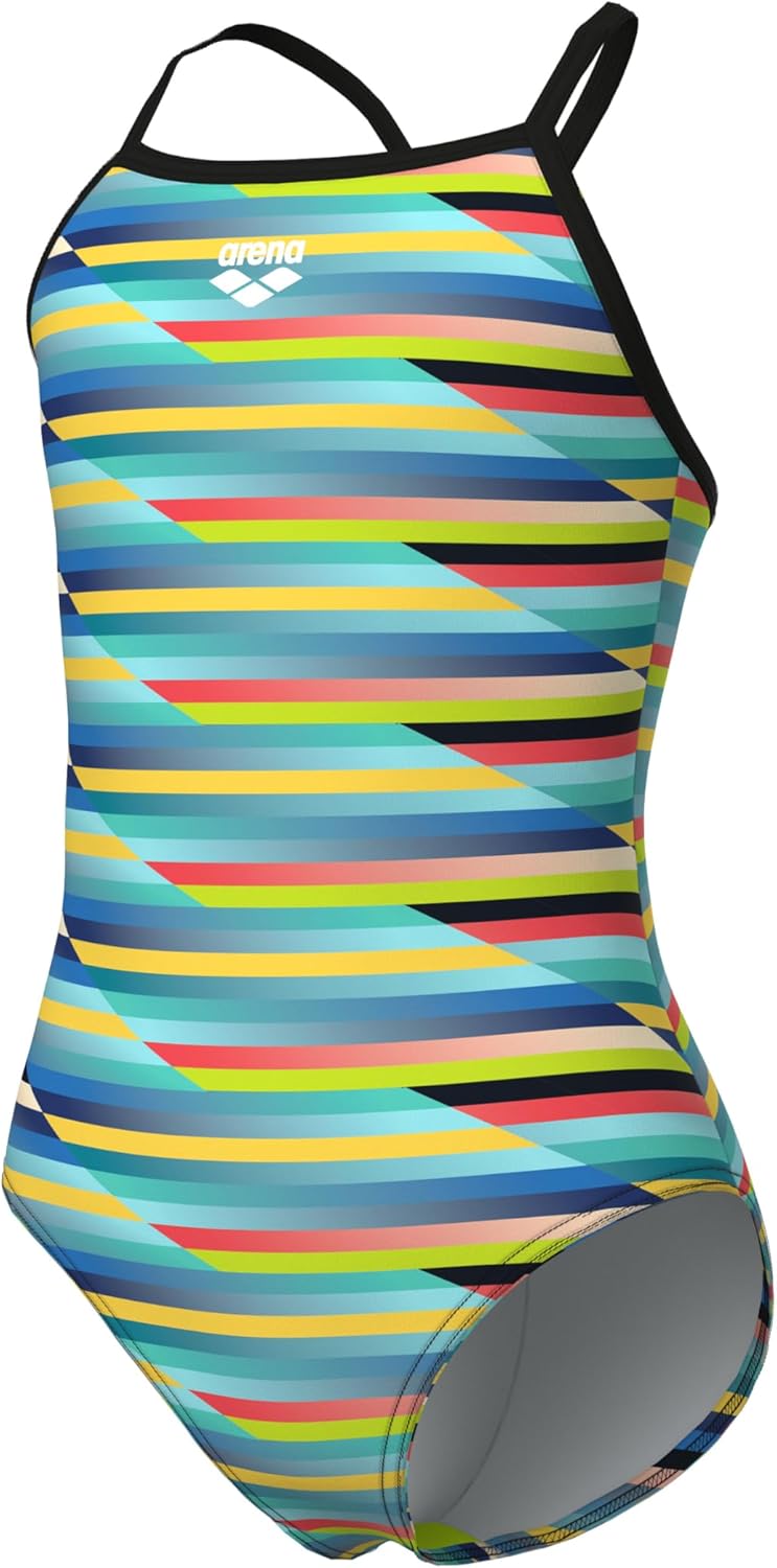 The perfect fusion of high performance and cool design! Enjoy the water in this stylish arena Racing Stripe Light Drop Back Swimsuit for girls that is ideal for both competitive and regular swimmers who swim frequently in the pool. The highly chlorine-resistant MaxLife Eco fabric with integrated UPF 50+ UV protection is extremely quick-drying and long-lasting. This version of arena's MaxLife fabric contains at least 50% recycled polyester from PET bottles. The ergonomic back and comfortable straps guarantee a secure fit and make the swimsuit easy to put on and take off. Ready for the pool! The fabric's OEKO-TEX® STANDARD 100 certification means it has been tested for harmful substances and is harmless to human health and the environment