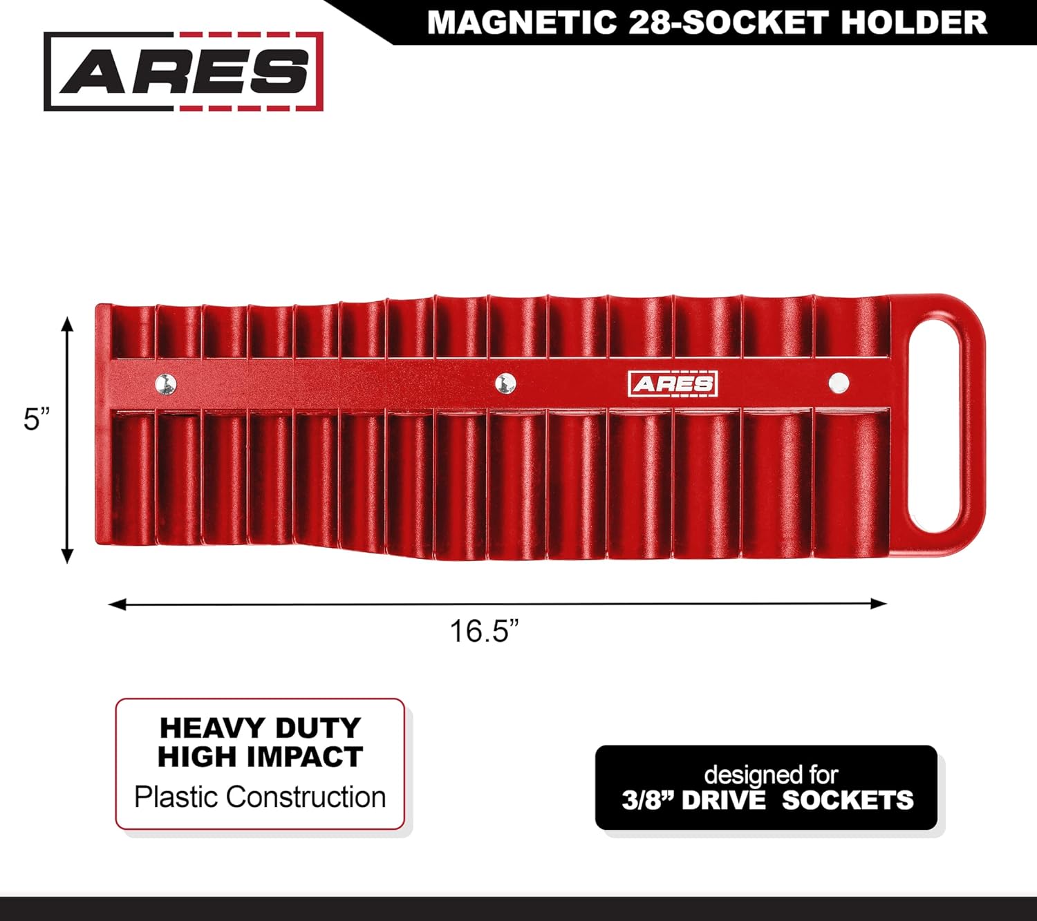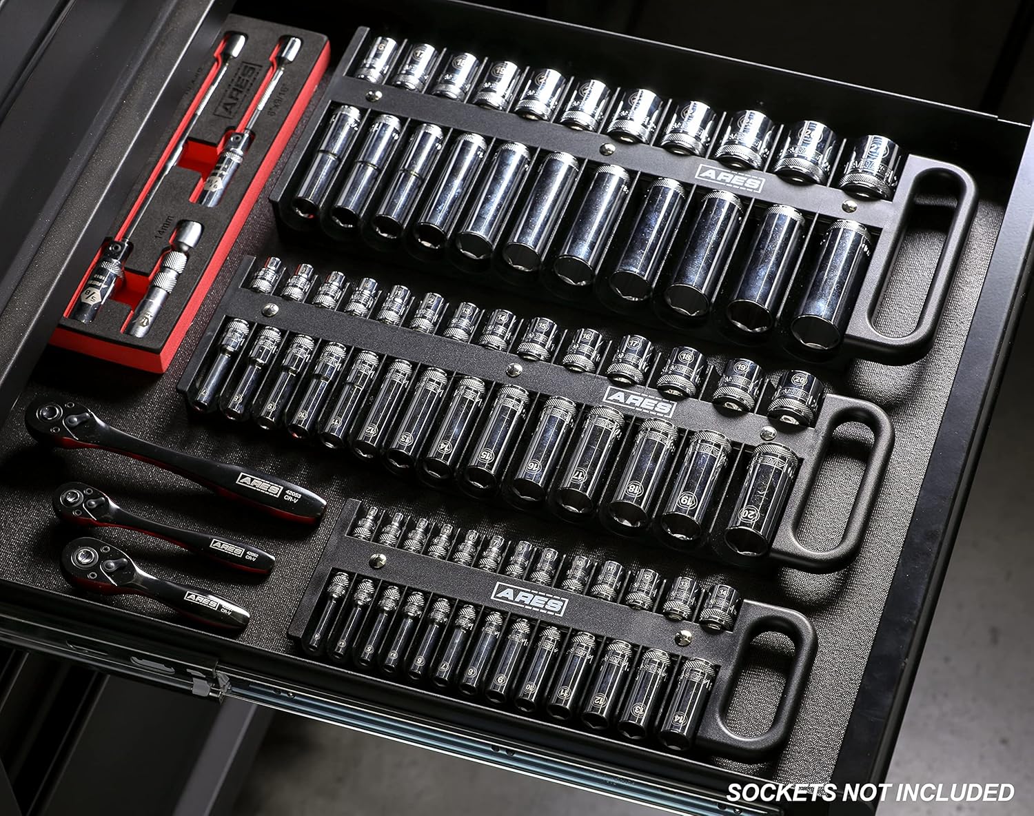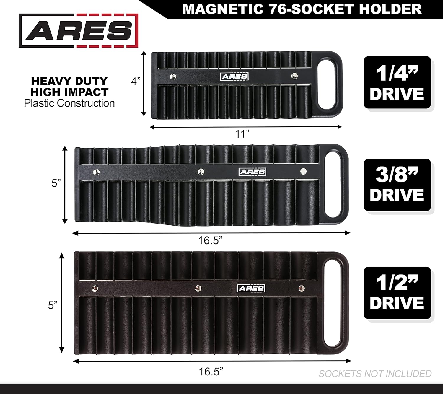 | Compatible Fastener Range | This ARES Socket Holder Set is compatible with 1/4-inch, 3/8-inch, and 1/2-inch drive sockets, both shallow and deep, as well as adapters and smaller extensions. |