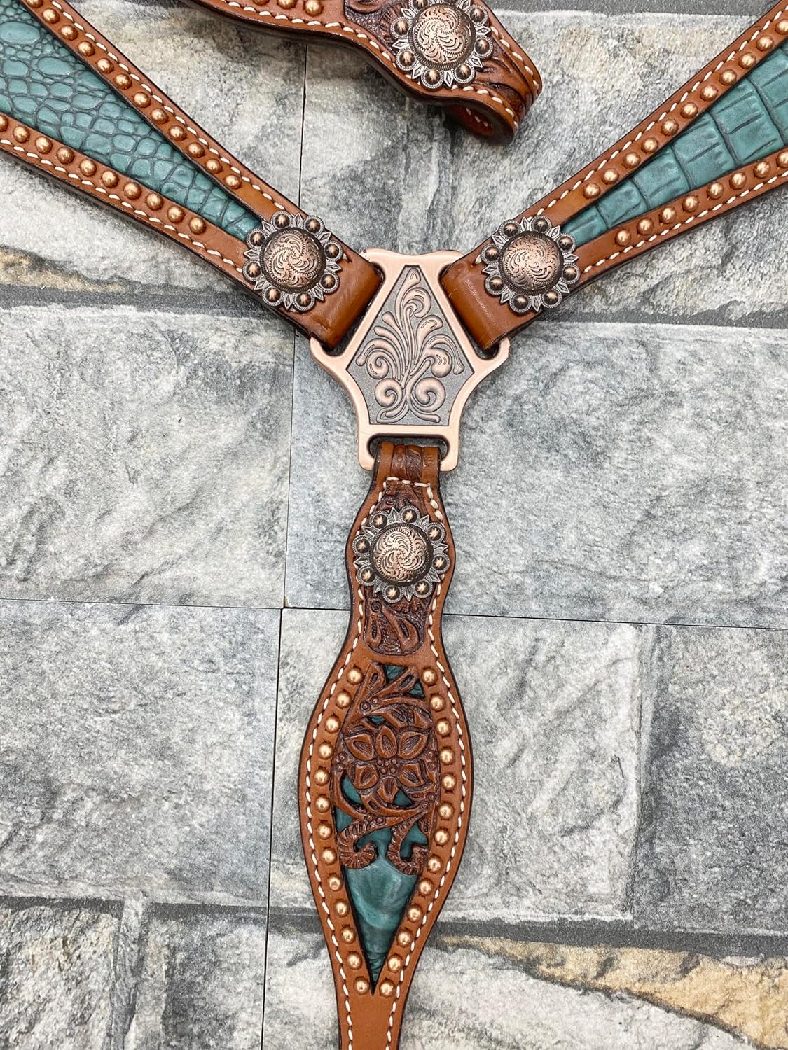 This exquisite equestrian accessory set is hand carved from authentic Argentina cow leather. Crafted with fine attention to detail, this set combines durability with luxury design. The wither strap, spur strap, bronze halter and breast collar are all included, making it a complete set for the average full size horse. Each piece is hand carved from premium quality leather ensuring comfort, strength and style in the saddle. Ideal for the serious equestrian seeking top-of-the-line tack, this set will enhance any rider's experience with its finely crafted leatherwork and sophisticated bronze accents. Careful handcrafting and selection of materials ensure this set will stand the test of time in the stable.
