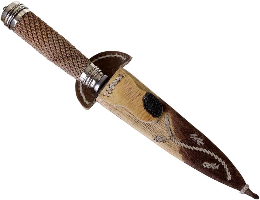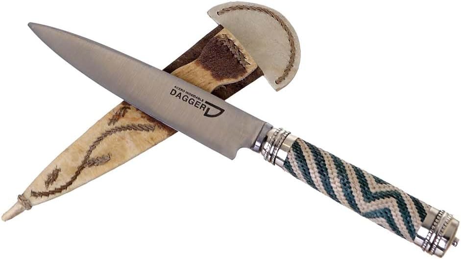 Handle is made of colorful woven leather - 420 stainless steel dagger blade, 14 cm - Embroidered leather sheath