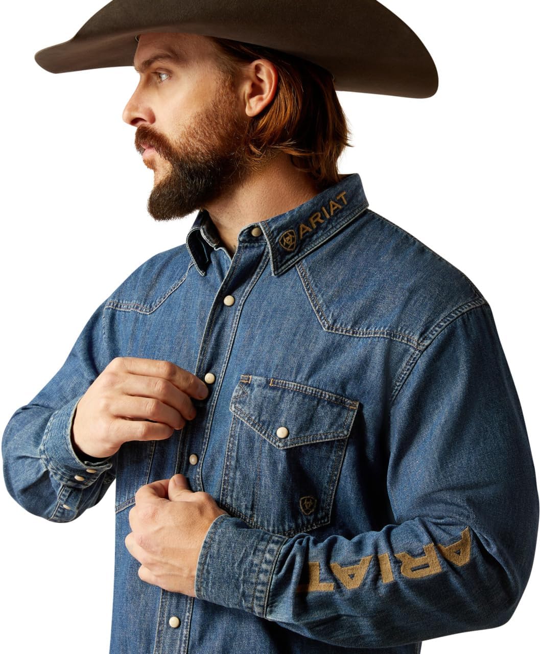 A classic denim shirt with some serious Ariat pride. It has the traditional styling you'd expect from the Western staple, but the embroidered logos make it stand out from the pack.
