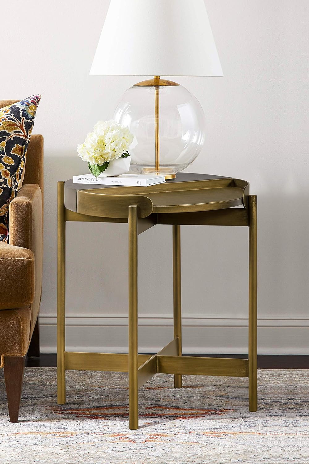 Master the art of form and function with the Armen Living Dua End Table. The round end table features an antique gold finish with a concrete accent top to add a touch of glamour to any home. The x-shaped base adds structure and sturdiness to ensure durability of the table. Modern and chic, this end table will elevate any decor in your home no matter where you place it. We stand by the quality, the craftsmanship, and the integrity of our product by offering a 1-year warranty for all our products. We want our customers to enjoy our product and we will always be there to help with our top-notch customer service support. Product Dimensions: 15.7 W X 15.7 D X 19.7 Included: 1 console table Table top: Concrete, Antique Brass Metal Material: Antique Brass metal Assembly Required: Yes Features: This eye-catching piece is a decorative accent to your home while being practical for use in all rooms Features: Two tone finish with concrete accent with antique brass metal for glamorous look Features: Concrete accent top is spacious, and the X metal base provide sturdy foundation Ships In: 1 Boxes Table Top Thickness: 2” Comes with standard 1 year limited warranty NOTE: Color and saturation may vary due to lighting and monitor/phone screen settings