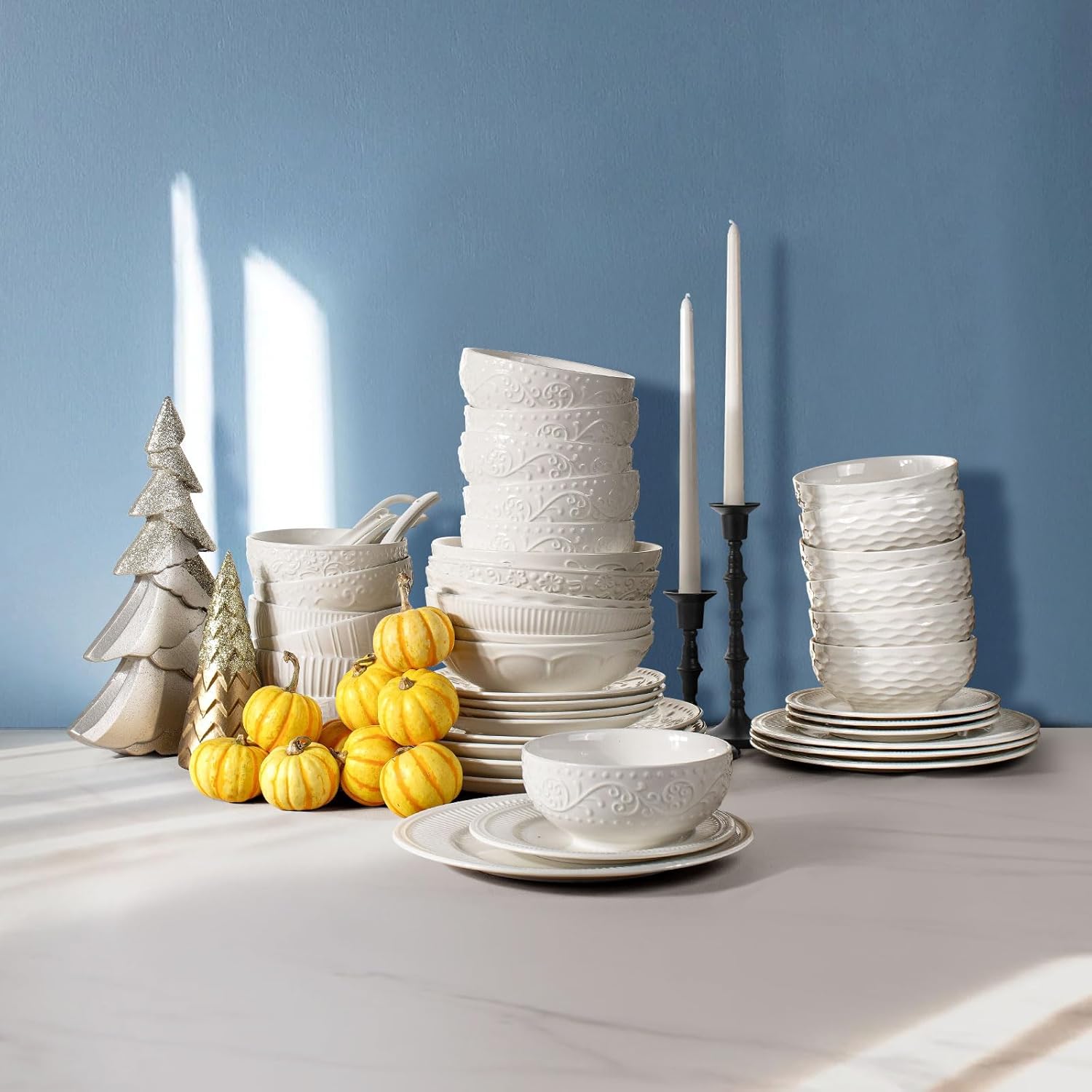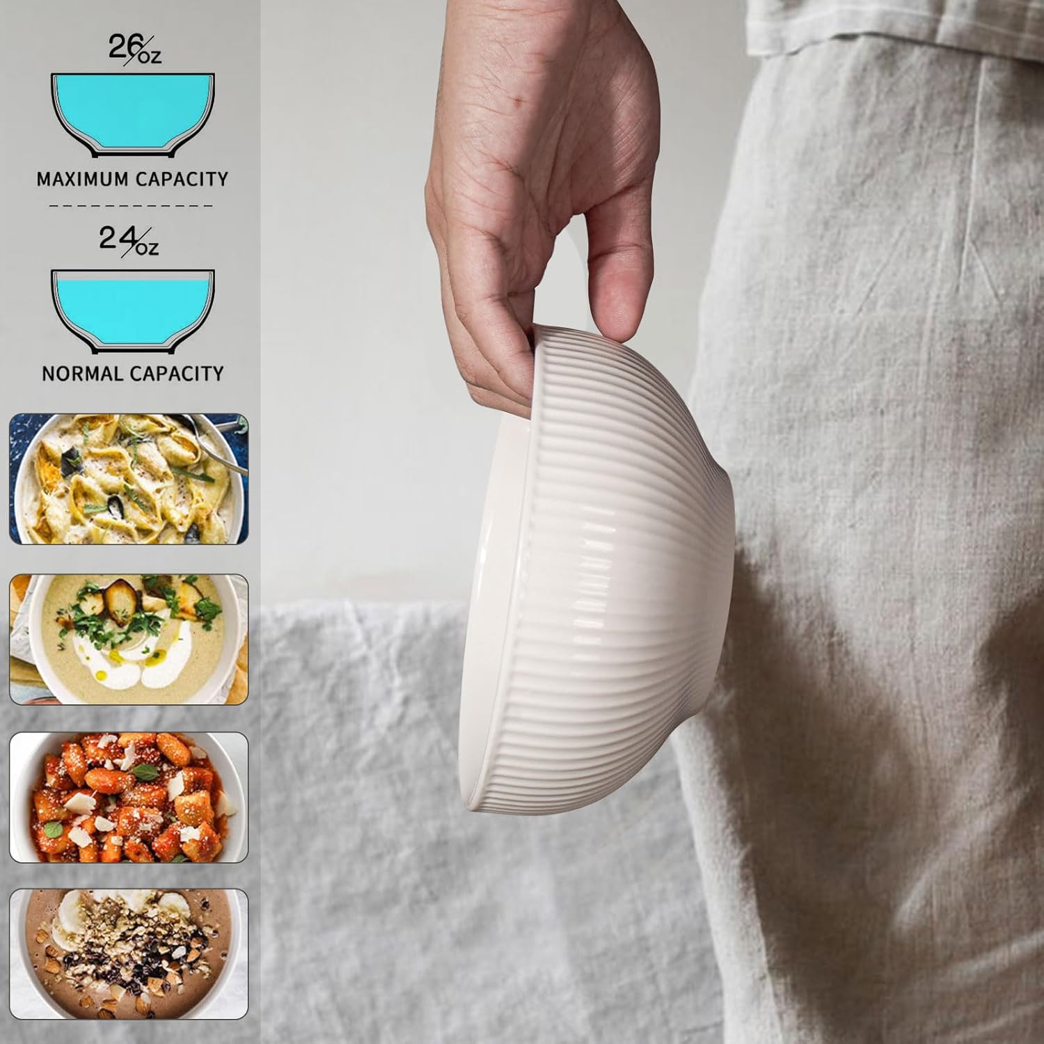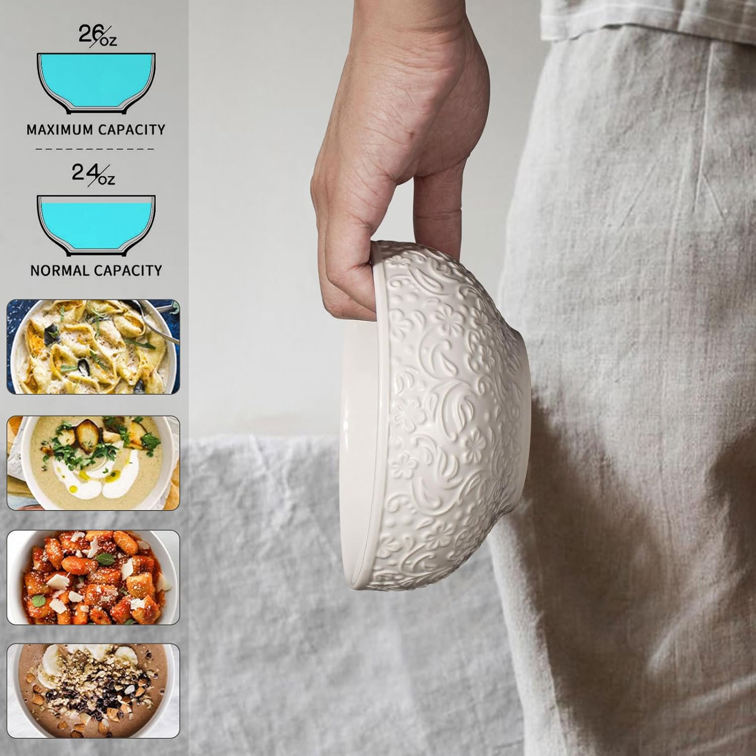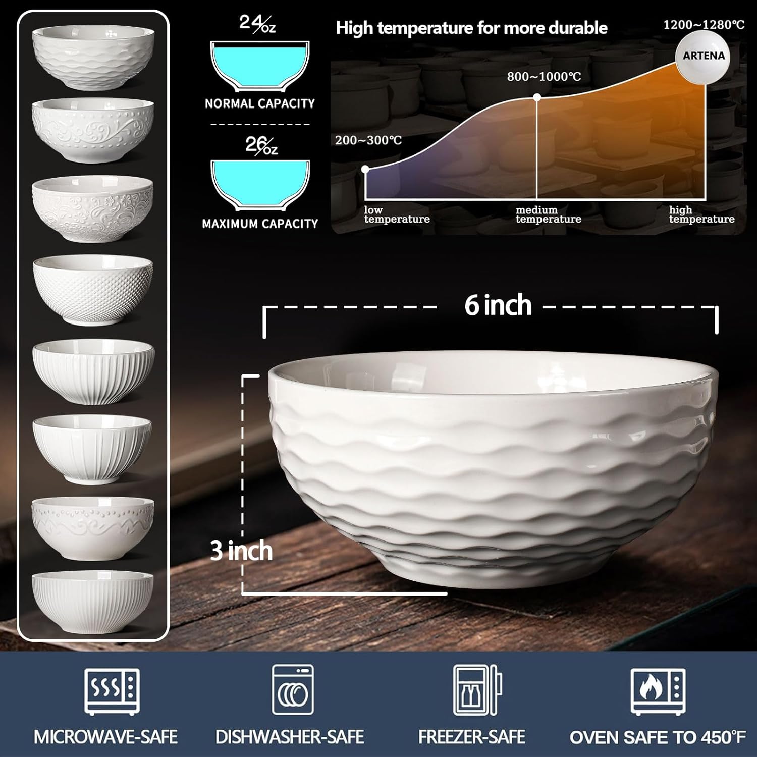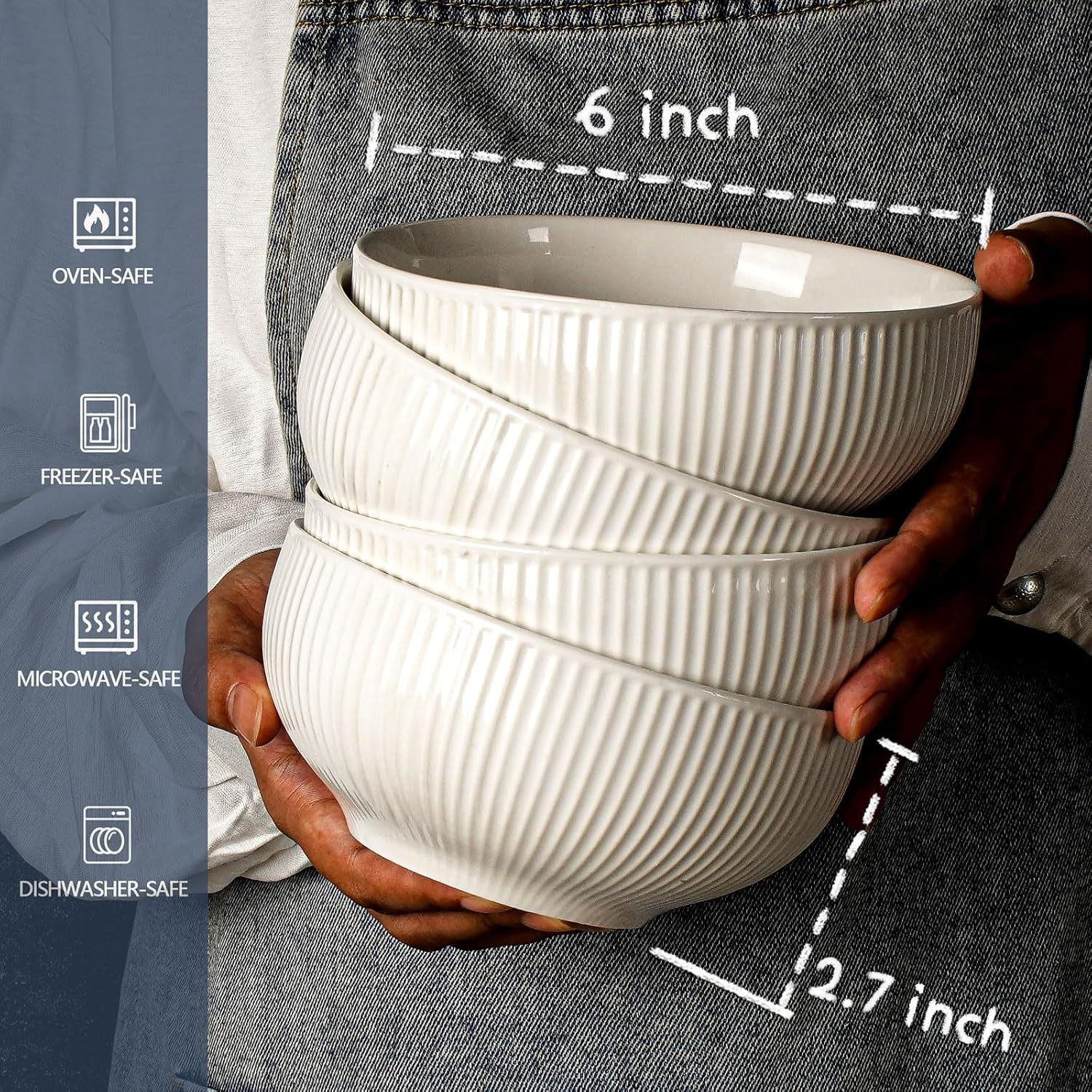 Deep and Classic bowls set is perfect for cereal, soup, nuts, salad, fruit, ice cream, rice, and noodle without spillage. Ideal for family dinners, food storage, breakfast oatmeal, restaurant service, parties, and holiday gifts. Effortlessly stackable and free up enough space for other dining sets in the kitchen cabinet and match most existing dinnerware. The smooth and anti-scratch glazed interior is easy to clean.