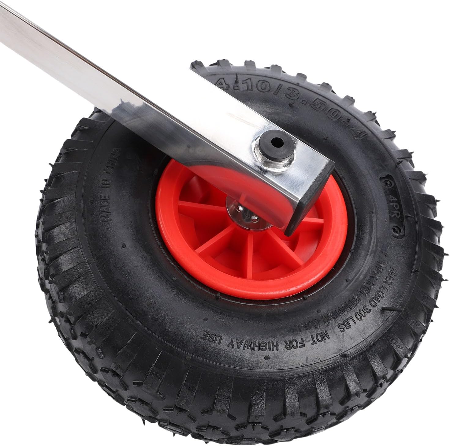 Product description 1. Heavy Duty Loading Capacity: The boat launching wheels feature a robust design capable of supporting up to 600 lbs, allowing single person operation for launching inflatable boats. 2. Rugged Stainless Steel Construction: The marine stainless steel boat launching wheel components are built with stainless steel and feature anodized coating for enhanced durability. The wheel arms withstand harsh marine environments. 3. Adjustable Wheel Positioning: The boat transom launching wheel offers 60° and 90° locking positions to optimize space on your transom. At 60° position, wheels align with propeller level to serve as protective guards during beach launches while maintaining clearance. 4. Secure Mounting System: The inflatable boat wheels install above the waterline to prevent screw hole erosion. Double bottom colinear bolts provide reinforced stability. 5. Quick Adjust Mechanisms: This transom launching dolly wheels incorporate three efficient adjustment systems, spring lock pins for wheel arm positioning, solid spring buttons for length adjustment, and Storage Case pins for wheel hub bearing maintenance. Specification: Item Type: Marine Launching Wheel Material: Stainless Steel Surface Treatment: Anodized Coating Tire Size: 4.10/3.50-4 Application: For Jon boats, dinghy, inflatable boats, mud boats, rowboats, sailing dinghies, etc. The wheels are suitable for grass, hard or soft sand, and dust. Package List: 2 x 4.10/3.50-4 Inflatable Wheels 2 x Water Wheel Arms 1 x Installation Accessories Kit (Total 28 Accessories) Note: The sizes are manually measured, please allow for slight variations. Manufacturer Contact Information 1
