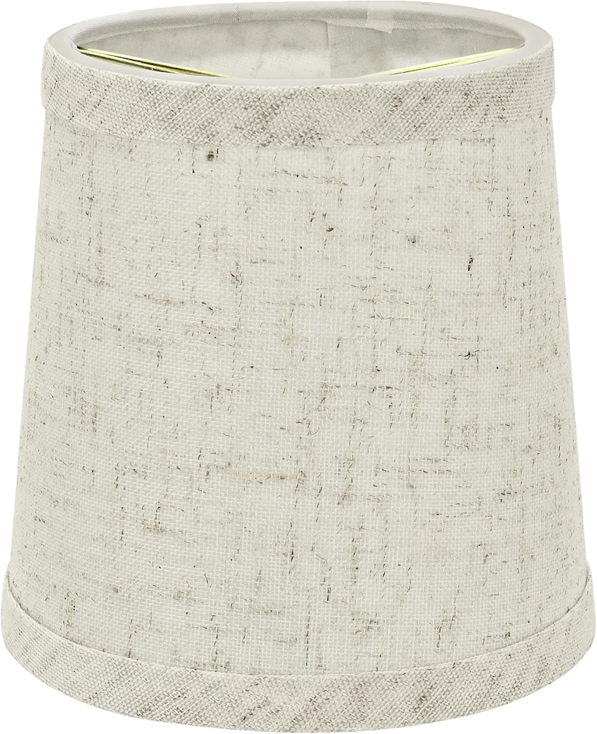 Aspen Creative offers a six pack of hardback empire shape transitional chandelier clip-on lamp shades in flaxen. Made with linen fabric. Its size is 4 inch top, 5 inch bottom and 5 inch slant height. Clip-on style fitter designed for bare bulbed chandeliers and wall sconces that use candelabra bulbs, bent tip style bulbs not recommended (not included). Our hardback shades use Virgin Styrene backing board to produce a warm, natural & smooth light – more appealing than shades made with recycled Styrene board that can crack & yellow over time.
