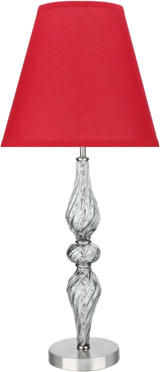 Aspen Creative is dedicated to offering a wide assortment of attractive and well-priced portable lamps, kitchen pendants, vanity wall fixtures, outdoor lighting fixtures, lamp shades, and lamp accessories. We have in-house designers that follow current trends and develop cool new products to meet those trends. Aspen Creative offers a 29" high transitional metal & glass table lamp with clear colored glass, with chrome base. This lamp comes with a hardback empire lamp shade in red . Lamp shade size is 7" top, 13" bottom, and 11 1/2" slant height. It has a on/off switch. Uses 1 medium base light bulb, 100 watt max, Light bulb not included and is UL listed. Aspen Creative hardback shades use Virgin Styrene backing board to produce a warm, natural & smooth light – more appealing than shades made with recycled Styrene board that can crack & yellow over time Applications - Aspen Creative table lamps are perfect for using as beside table reading lamp, living room or family room end table lamp, bedroom night stand lamps and general reading light at home study and offices.