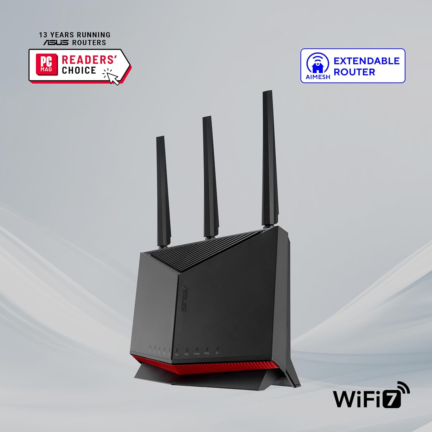 The Asus RT-BE86U is a successor to the ancient RT-AX86U. Supports WiFi 7. Offers dual-band 6800Mbps speed. It has a 10G WAN/LAN port and four 2.5G LAN ports. 20G combined network capacity. ASUSWRT 5.0 operating system is available.