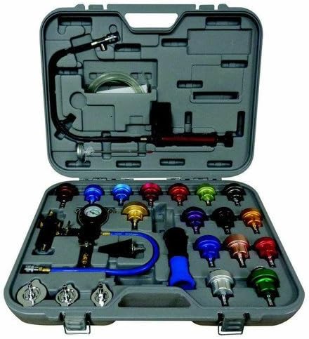 Quickly reveals external cooling system leaks. Detects internal engine leaks caused by blown head gaskets and/or cracked block or heads. Easily test entire cooling system, including radiator, heater core and radiator cap. Vacuum purge and refill kit to refill cooling system and eliminate air pockets. Kit includes: Hand Pressure pump with color coded 0-35psi gauge and push-button pressure relief valve, Temperature gauge, 3 chromed steel radiator adapters, 16 Anodized aluminum radiator adapters, 1 Universal radiator adapter, 2 Radiator Cap test adapters, 3 piece Vacuum purge and refill kit, Instructions, Storage and carrying case.