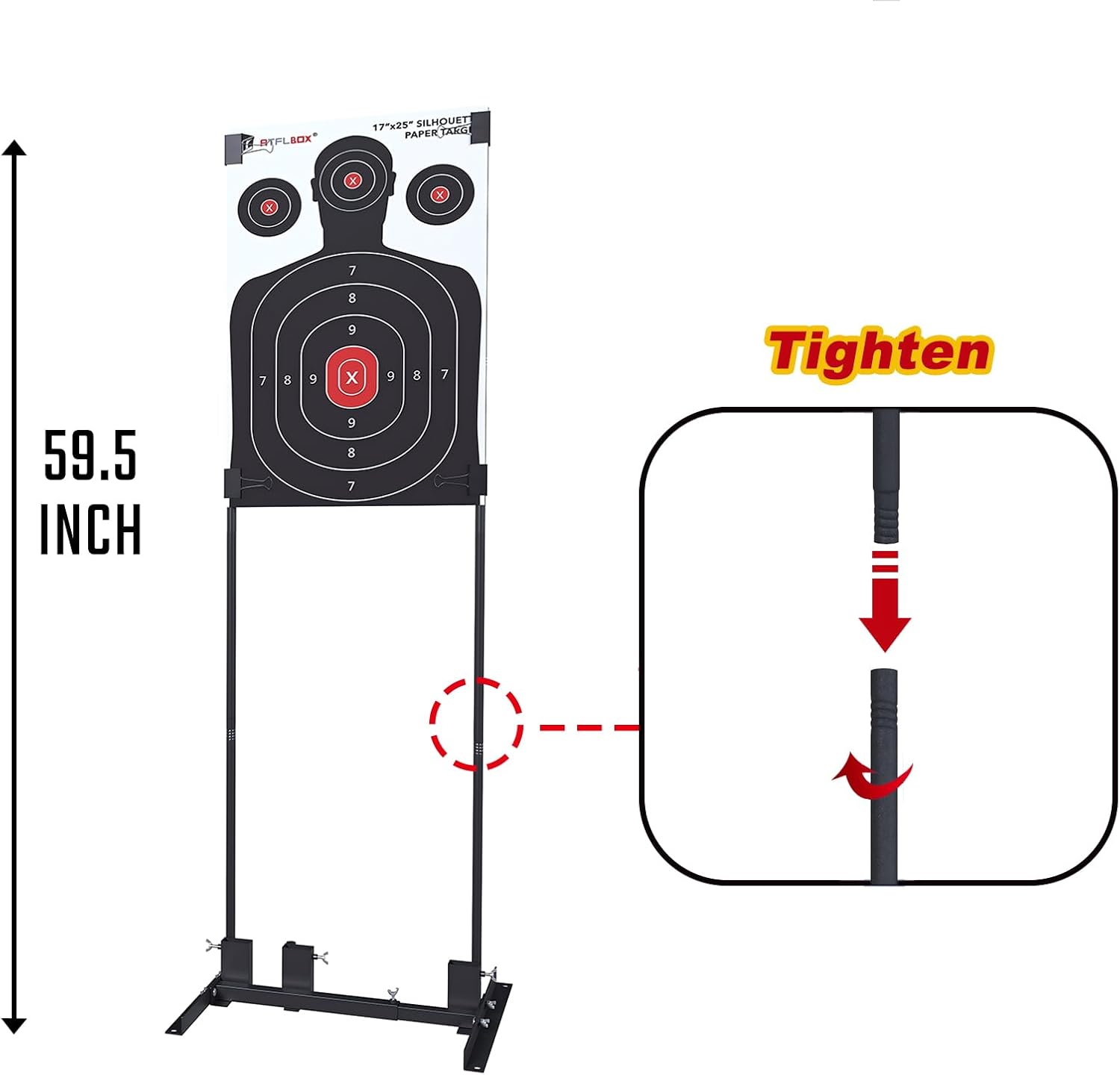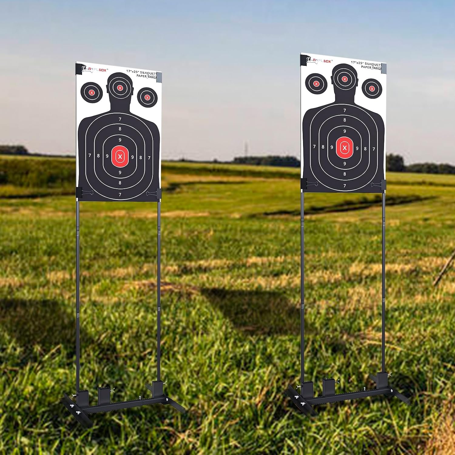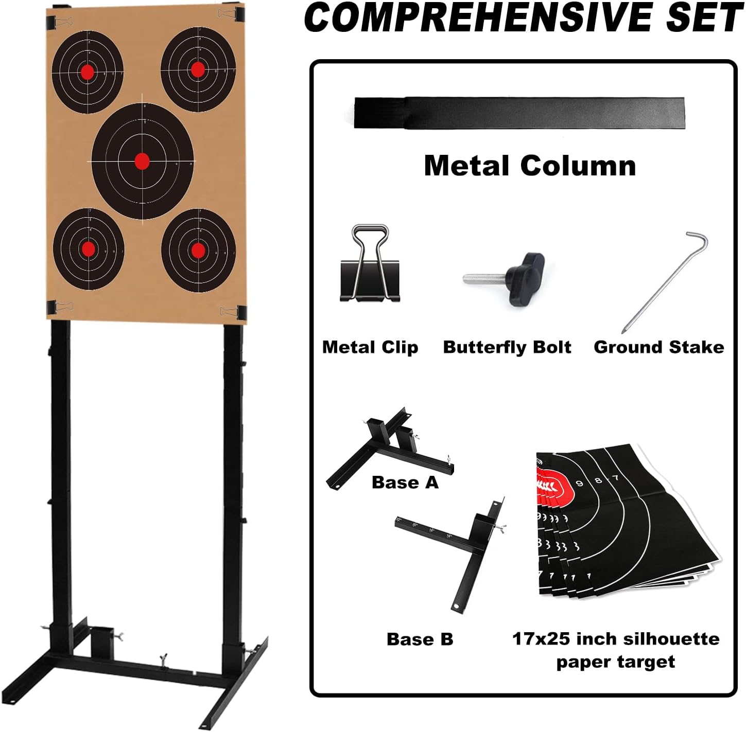 Introducing our innovative shooting target stand that comes equipped with all the necessary accessories, without requiring an extra 1x2 board. Instead of using boards, we have used Metal Columns for support. Additionally, we have included 10 pieces of 17" x 25" shooting paper targets that you can use as soon as you receive them. You can also cut open the box and use it as a cardboard silhouette target. The target stand is adjustable, making it compatible with 8-24 inch paper targets. You can easily adjust the stand without using any tools, and it also features clear size markers on the base, making it simple to adjust the position. Our target stand is made of durable iron and can accommodate various sizes of shooting paper targets, making it flexible for different shooting activities and preferences. It is sturdy enough to hold the shooting paper targets securely. Additionally, we provide 4 ground stakes to prevent the paper targets from moving or falling when shooting in windy conditions. The target stand is easy to use, and the adjustability makes it suitable for a variety of shooting training scenarios, such as shooting ranges, shooting clubs, and backyard shooting. It is ideal for shooting enthusiasts. Moreover, motherboards that measure up to 1.81 inches * 0.86 inches fit perfectly into our target stand.