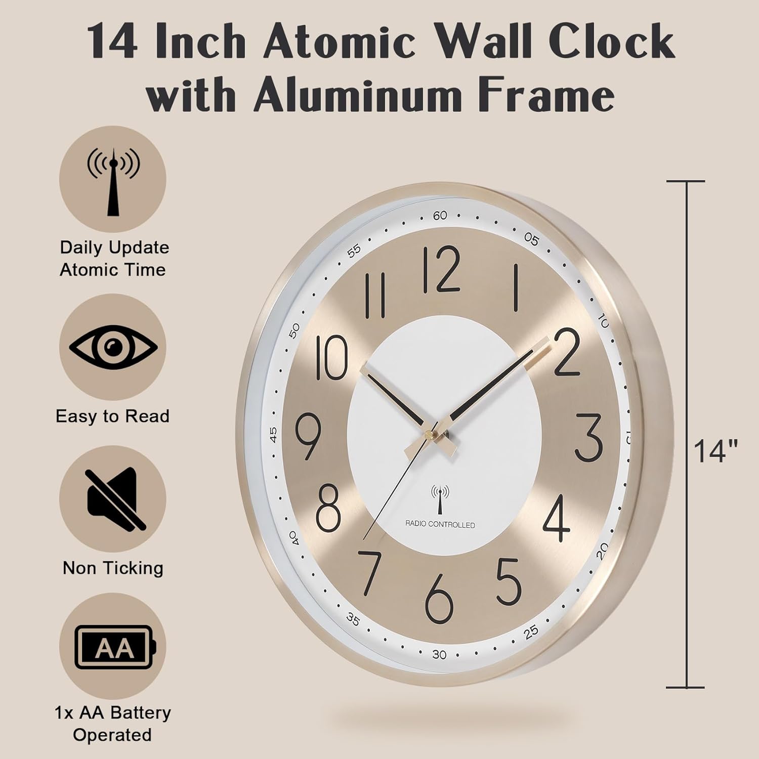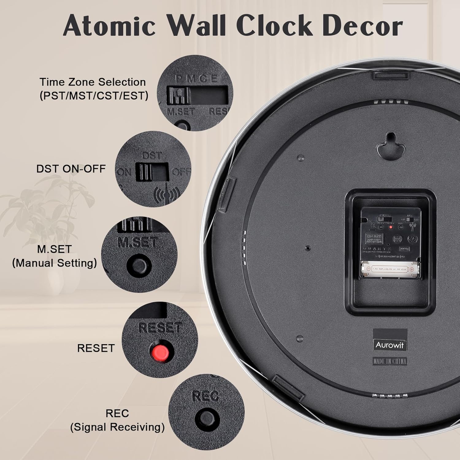 1*14 Inch Atomic Analog wall clock, 1 x AA batteries not includedNOTE: keep clock at least 5 ft away from electronic devices, which would give off any electrical frequency, which could disrupt radio-controlled radio frequency reception to clock.What can I do to improve signal reception?1.If you plan to use this clock in a concrete or metal building, reception will be improved if the clock is placed near a window. 2.Do not place the item too close to electrical appliances such as television, microwaves, speakers, computers or fax;3.Bad weather can also affect the signal