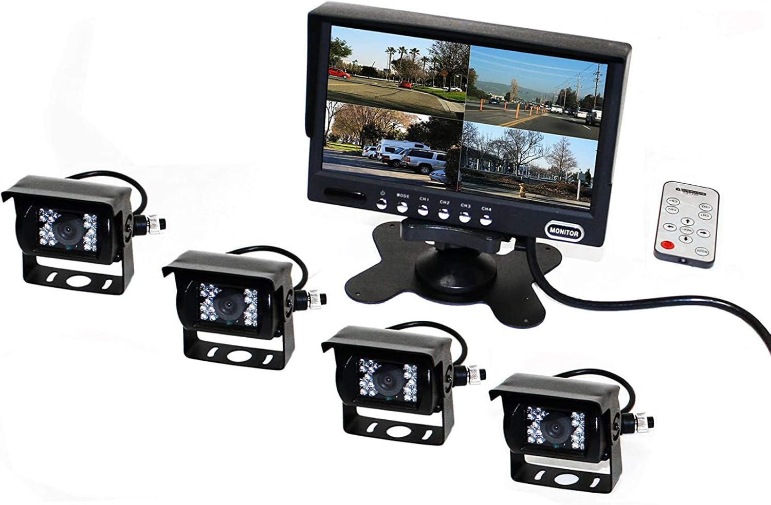 Pakage Included: Remote Control + 7" LCD Monitor + 4 x Cameras + 4 x 4pins 50feet Comunication Cable + Main Cable Features 7" Quad Monitor: Aspect Ratio 16:9 | Luminance: 250 CD/m² | Resolution: 800x480 RGB | Built-in Quad control box screen function | Support four video camera inputs (V1/V2/V3/V4) | Single Full View / Split Dual Video View / Quad four Source View | Audio & Video: 4 Ways video input, 1 way audio input, 4 ways trigger System: Pal & NTSC Automatically | Voltage: 12V-24V | Language: Multi-Language | OSD Menu: Display Menu - Brightness - Color - Contrast Adjustable | Built-in Speaker | Removable sunshade | Set up mirror for individual image - Can set reserve delay. Features 4 Cameras: CMD weatherproof Reaview Camera system | Image Sensor: Color CMD | System: Pal / NTSC auto Switching | Video output: 1.0V pp-75 Ohm | Effective pixels: 580x540 | Resolution: 420 lines | Lens Angle: 170 Degree IP rating: IP68 | Min illumination: 0.2 Lux | Auto image Adjustment | 18 LED IR Night Vision illumination | Distance Scale line | Designed for Car/Truck use 12 & 24 Volt Systems | Camera Dimansions: 3.18" W x 2.95" H x 2.17" D