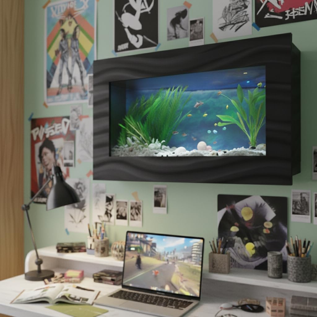 Transform Your Wall into a Stunning Aquatic Focal Point with Aussie Aquariums 3.0 Wall-Mounted Fish Tanks. Stop sacrificing valuable floor and counter space for a traditional tank. This sleek, modern wall-mounted aquarium is designed to look like a contemporary piece of art, blending the calming beauty of aquatic life with minimalist home décor. The striking design makes your fish tank a unique, conversation-starting feature in any room. Our one-of-a-kind wall-mounted aquariums are sure to please the senses. We take the beauty of an everyday aquarium and turn it into a work of art....literally. You can decorate your new aquarium with any ornaments, gravel, sea rocks, or shells that you like, as they are open at the top. Key Features & Benefits Space-Saving Design: Perfect for apartments, offices, small rooms, or hallways. It mounts directly to the wall, freeing up tabletop and floor space. Brushed Finish or Matte Painted Finish: The aluminum frame features a premium, brushed finish or painted matte finish that complements modern, industrial, and nautical-themed interiors. All-in-One Convenience: At only 4.5" deep, Aussie Aquariums create a spectacular world for a variety of marine life. All the basics of your dream aquarium are included. Includes the essential components you need to get started, such as a multi-stage filtration system, custom-fit lid, and energy-efficient LED lighting, along with the basics like a fish net, background paper, siphon cleaner, grabber tongs, and mounting brackets with toggle clips. Easy to Install & Maintain: We simplified the mounting to make it even easier to set up in under an hour. Offered in a variety of finishes. Comes with secure mounting hardware. The accessible design simplifies water changes and feeding. Requires minimal maintenance and is easy to clean. Model: Skyline Approximate Capacity: 5 Gallons Outer Frame Diameter: 35.4 in x 17.5 in x 4.5 in Material: High-quality Glass Tank with Brushed Aluminum Frame