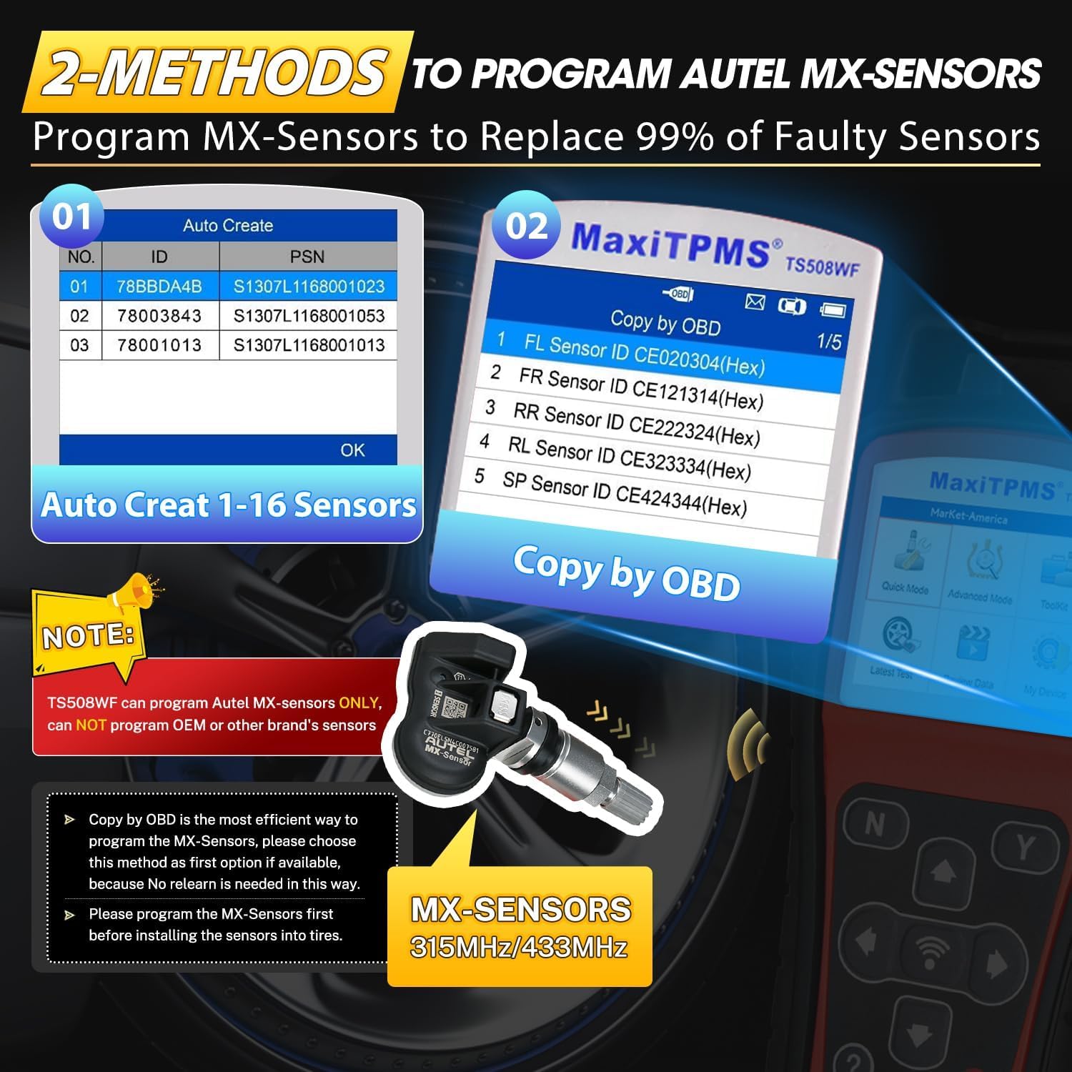 | Included Components | 4PCS Autel MX-Sensor, Metal Stem, MaxiTPMS TS508WF Main Unit, OBD ll Cable, USB Cable, AC Adapter, User Manual, Carrying Case |