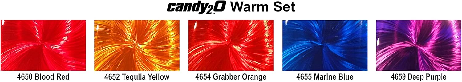 Candy2o Warm Set includes 4oz. each: Blood Red, Tequila Yellow, Grabber orange, Marine Blue, Deep Purple, 4030 Intercoat.