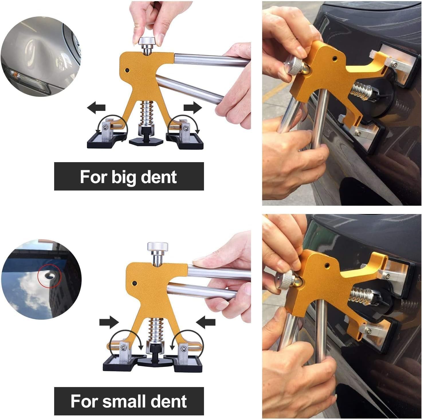*Why Choose AIRERVO Dent Removal Kit?Sometimes we find a small dent in the car. How to repair that? Go to the 4S shop? the dent wasn't touched off the paint, if go to the repair shop to pull the gold you will distress original paint, but also worried about the color. In fact, this kit is ideal to repair, saving you time and cash as you witness these tabs restore your car's charm like it's never been damaged before.*Specifications:--Paintless dent repair kit can ensure 100% protect the original paint--Comes with easy-to-operate golden dent lifter and rubber hammer--Inclusive of 16 pcs thickened and enlarged rubber tabs in different sizes--Made of high-quality aluminum alloy and stainless steel materials--5 different kinds of trimming tools, excellent for trimming car audio/radio removing--This tool bag also contains 100 watt hot melt glue gun and glue stick, you not need to extra purchase them.--Most of the dent removal can be finished in half hour.--Safe on all car surfaces including on metal plates*Warm Tip:You can read the detailed repair steps introduction before you operate, it makes the dent removal process so easy. If you don’t know how to use the dent puller tool, please contact us, we will send the video link to you.*Packing lncluded:1 X Golden dent puller1 X Rubber hammer 1 X Metal tap down pen(with 9 heads)1 X 100 watt Hot glue gun5 X Yellow glue sticks5 X Black glue sticks5 X Pry tool16 X Black puller tabs2 X Small plastic shovel1 X Empty alcohol bottle1 X Dishcloth1 X Instruction