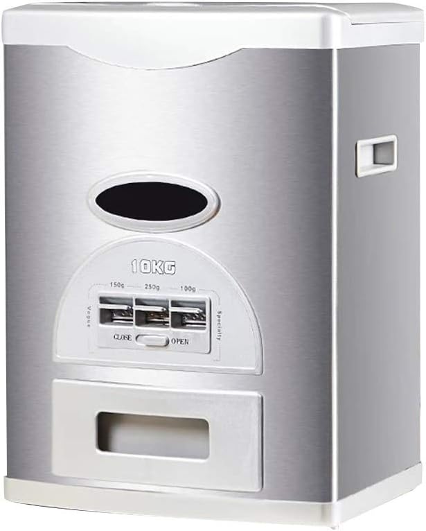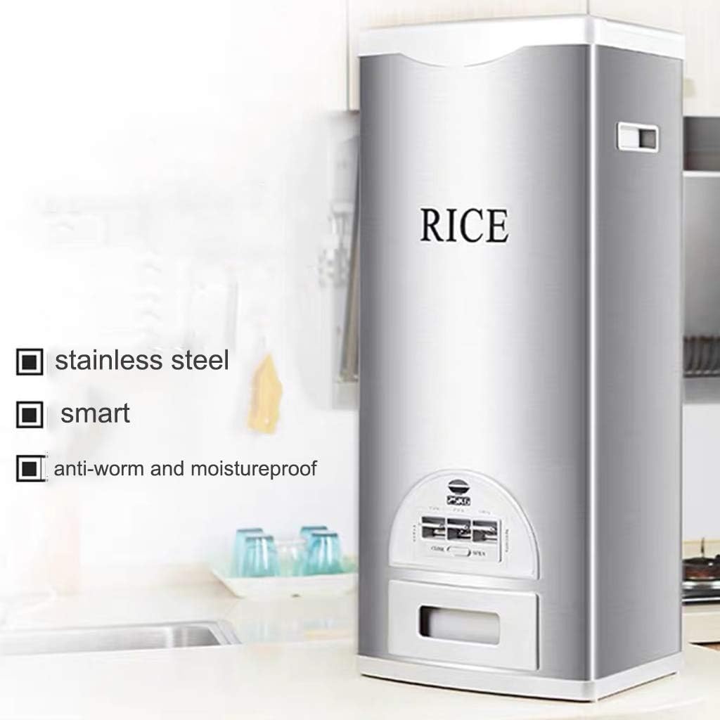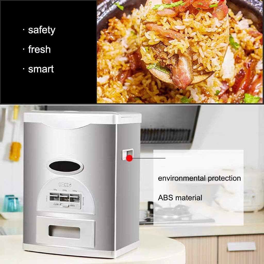 ★ Why Choose us:- Safety and durable stainless steel material.- Sealed cover to keep the rice aways fresh.- Three gears measure button. Automatically dispenses 100g/150g/200g(0.22/0.33/0.55 pound) per button push.- Keep Clean and Organized with Precise Measurement.- Save space of your kitchen.- Multi sizes can be optional.★ Warm tips- Because of manual measurement, the error is 0.1-0.8cm(0.03-0.3inch), please refer to actual size.- We only sell rice dispenser, other items are props.
