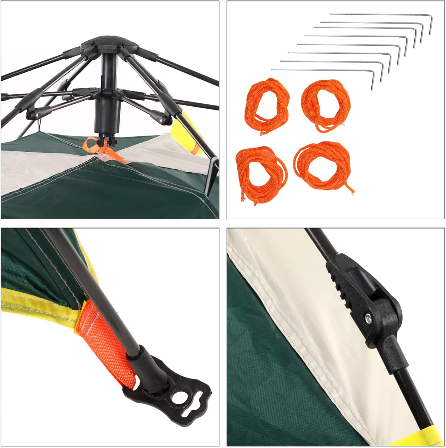 [HIGH PERFORMANCE] Crafted with premium waterproof fabric and featuring a PU coating on the inside and waterproof treatment on the outside, this tent ensures you stay dry and comfortable even in the harshest weather conditions. Its construction is designed to withstand rain, wind, and other outdoor elements, making it a shelter for all your adventures.[MULTI FUNCTIONAL] The double-layer design enhances ventilation and air circulation, keeping the interior fresh and comfortable. The inner tent includes a net cover on top and net layers on both doors to protect against mosquitoes. Additionally, the outer tent can be used as a standalone canopy, perfect for fishing trips or relaxing at the beach.[SIMPLE ] Setting up this automatic tent is a breeze, taking only a few seconds. Simply press down on the top hydraulic bracket to ensure it’s fully open. Folding and storing the tent is equally effortless, with just a few steps needed to pack it neatly into the included duffel bag, making it ideal for quick getaways.[SPACIOUS DESIGN] Measuring approximately 2.1x1.9x1.45m (82.7x74.8x57.1in), this tent offers ample space for 2 adults, with the flexibility to accommodate 3 or 4 people when needed. Its generous size ensures comfort and convenience, making it perfect for family outings or group camping trips.[IDEAL CHOICE] This tent is not only quick to install and disassemble but also versatile enough for various outdoor activities. Whether you’re camping, hiking, or enjoying a day at the beach, it provides excellent protection from rain and wind, ensuring a pleasant and worry- experience in the great outdoors.Spec:Item Type: TentMaterial: Glass Fiber Rod, PU Cloth, Oxford ClothColor: As Picture ShownApplication: for Sandbeach, Lawn, OutdoorProduct Size: Approx.2.1x1.9x1.45m/82.7x74.8x57.1inGross Weight: Approx.2840g/100.2ozPackage List:1 x Camping Tent1 x Poncho4 x Rope8 x