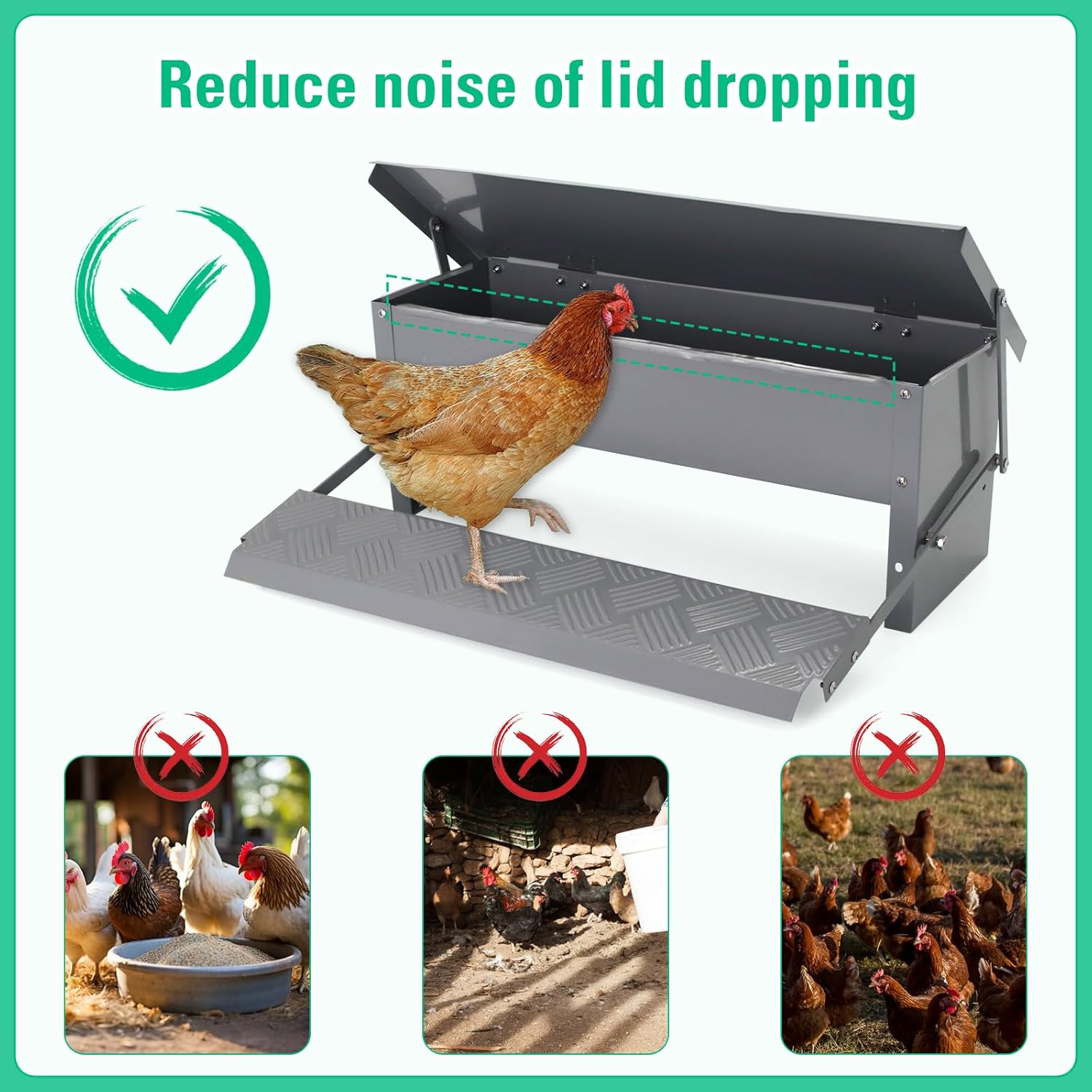 Automatic Metal Treadle Feeder Outdoor Rainproof - Suitable for Chickens, Bantams, Poultry, Pheasants, 15lb CapacityFeatures:[1]Rubber strip: Reduce noise of lid falling[2] minimize feed wasteSpecifications:Material: Iron Paint CoatedCapacity:5kg/11lbColor:Light GreySize of Feed Trough: 51*16.5*10cm /20*6.5*3.9inchCapacity of Feed Trough:8.4L , holding feed about :11LbPacked include:1* Automatic Chicken feeder (need installation)1* Installation InstructionTips:An Advice About Training the Chickens.You can keep the lid at half open setting first two weeks so that the chickens to get used the movement and noise. Once one chicken figured it out, the others soon followed her exampleAbout Extend the service life for outdoor usageYou can make a small free standing shelter outdoor to prevent the feeder rains and storms and keeps the lift step cool in the hot sun too.Advice about during using this automatic chicken feederyou should check every couple days and make sure the feed is falling down to the front.