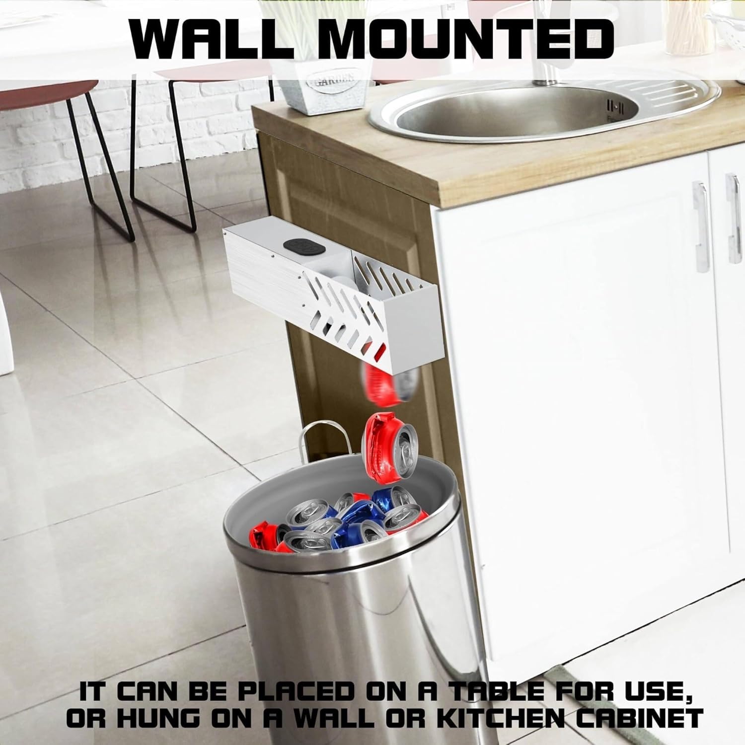 The Automatic Electric Can Crusher is the perfect solution for efficient recycling and space-saving in your home or business. This wall-mounted can crusher is designed to handle standard 12oz and 16oz aluminum cans, as well as plastic water bottles (6oz-12oz). The motorized push-button system offers convenient operation without the need for an external air compressor, making it a hassle-free option for users.Its wall-mountable design saves valuable counter space and ensures easy installation with just two screws. Whether you're crushing soda cans, beer cans, or juice cans, this crusher reduces the size of waste by more than 80%, making it easier for sanitation workers to handle recycling.Perfect for homes, bars, restaurants, and schools, this tool is , reliable, and a must-have for anyone looking to minimize waste and contribute to a greener planet. Make your recycling process more efficient with this powerful electric can crusher today!