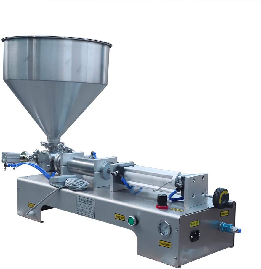 ApplicationIt is suitable for daily chemicals, food, pesticides, special industries, etc. It is suitable for all kinds of high-viscosity liquids and pastes, such as honey (non-consolidated state), cream, ketchup, mustard, fine-grained chili sauce (particles φ ≤ 10mm), etc., as well as for filling oil, wine, soy sauce, beverages, hand sanitizers, detergents and so on.SpecificationMount Type: DesktopAssembly Required: YesStyle: ModernColor: SilverMaterial: 304 Stainless Steel, 201 Stainless Steel, PTFEVoltage: 110V 60 HzPower Source: Corded ElectricityPlug Type: US StandardPower: 30WWorking Mode: PneumaticControl Mode: Foot Pedal/AutomaticNumber of Filling Heads: 1Working Air Pressure: 0.4-0.6mpaApplicable Bottle Neck: >10mm/0.39inHopper Capacity: 30L/7.9 gallonsSingle Filling Capacity: 100-1000 ml/3.38-33.8 oz.Production Capacity: 15-35 Bottles/MinuteFilling Accuracy:≤1%Product Size: 45*30*110cm/ 17.7*11.8*43.3 inFilling MachinePackage Size: 107*30*29cm/42.13*11.81*11.42inGross Weight: 24.45kg/53.9lbsNet Weight: 23.23kg/51.21lbsHopperPackage Size: 41*41.5*41.5cm/16.14*16.34*16.34inGross Weight: 4.2kg/9.26lbsNet Weight: 3.99kg/8.8lbsPackage Included1* Paste Filling Machine1* Hopper1* Hopper Lid1* Foot Pedal1* Power Cord