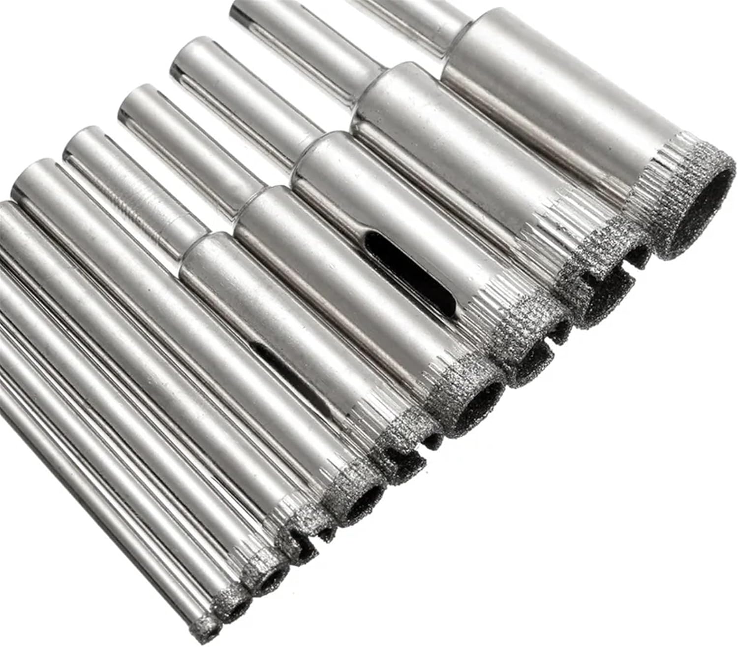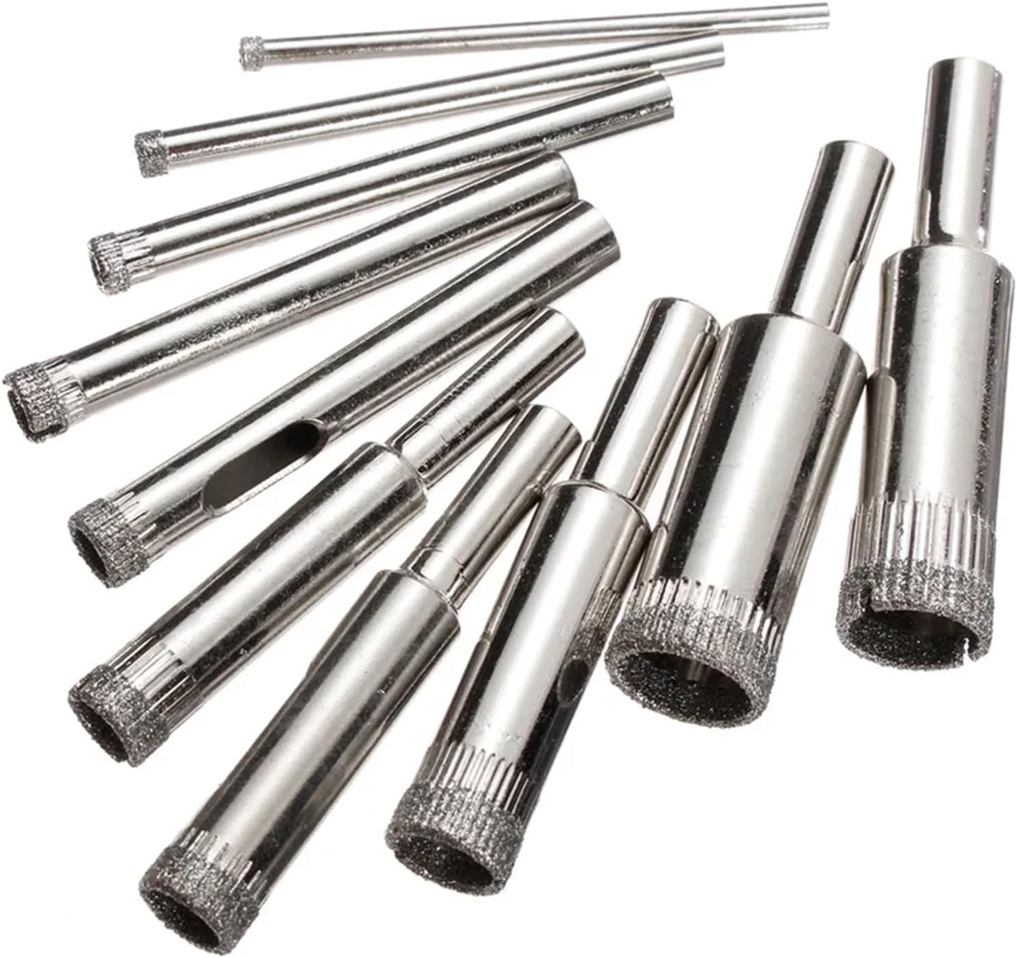 AccessoriesFeatures:These Diamond Bits are Capable of Drilling into Extremely Hard Materials Such as Stone and Glass. Use a Low Speed Setting and Proper Cooling, Such as Water, to Ensure Longer Lasting Life.Use With any Drill or Power Tool That Will Accept a 1/8" Diameter ShankSuperior Performance - Cut Holes in Marble, Slate, Glass, Tile, Stone, etc...Great for Home, Hobby, Craft, Construction, etc...Specifications:Diamond Grit: 100 (Medium)Hole Saw Diameters:3/32", 1/8", 5/32", 13/64", 1/4", 9/32", 5/16", 11/32", 3/8" and 7/16"(3mm, 4mm, 5mm, 6mm, 7mm, 8mm, 9mm, 10mm, 11mm, 13mm)Packaged included:1 set Diamond Hole Saws(10pcs)