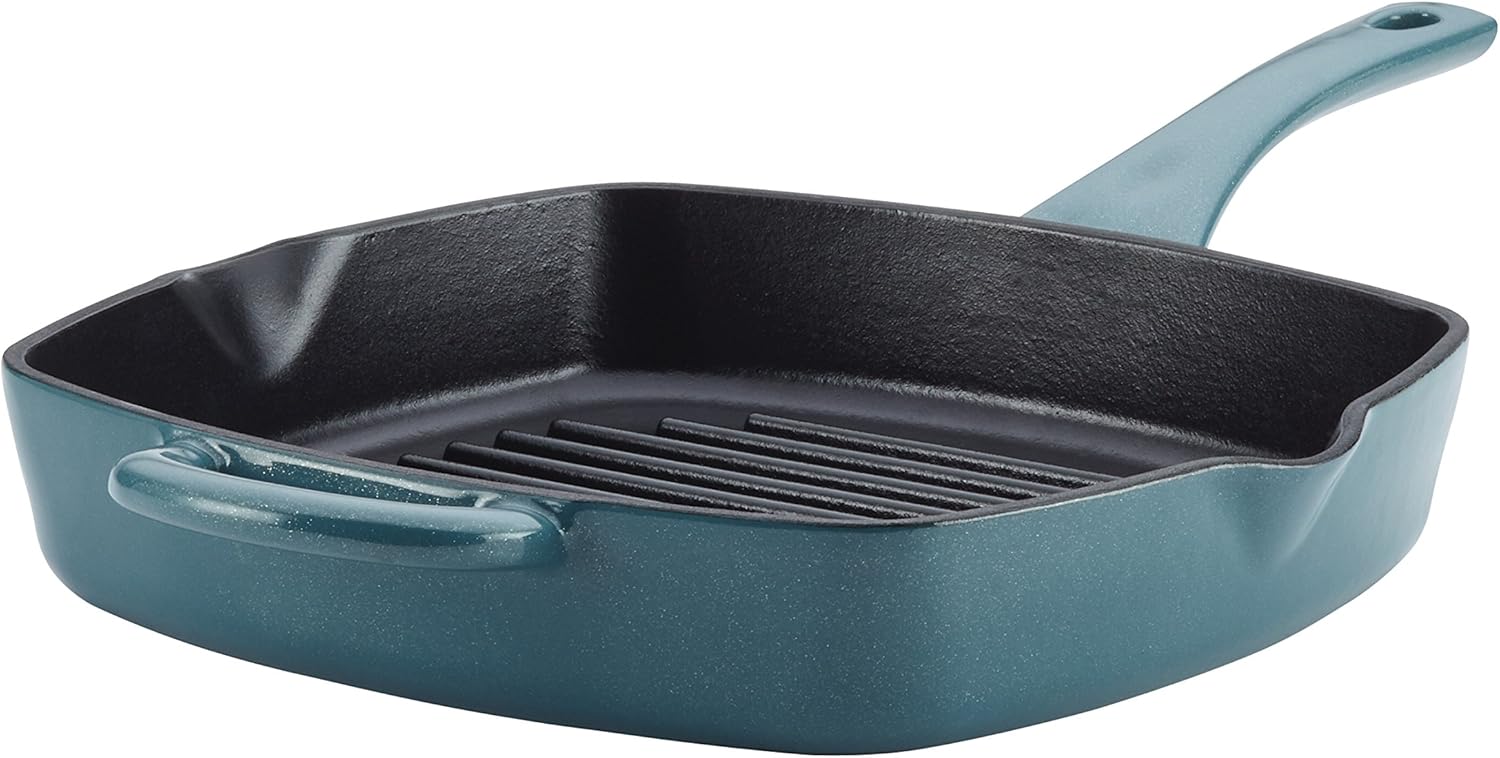 Get ready to make fun, flavorful meals and put your signature twist on traditional recipes with the Ayesha Collection 10-Inch Cast Iron Square Grill Pan. Constructed from durable, virgin ore cast iron, this grill pan is ideal for cooking on any surface including gas and induction and is perfect for searing up healthy skinless rosemary chicken breasts to pair with white cheddar mac or for pulling off Ayesha's Easy Pan Steaks for a sophisticated mid-week feast. The cast iron body features matte black enamel on the pan's interior for great searing and browning and a glossy metallic fleck enamel on the pan's exterior for a modern countertop style accent. Plus, the pan's raised edges provide plenty of room for one pot meals. A solid main handle and smaller helper handle make it practically effortless to pull together crispy, juicy pork chops and apples on the stovetop and then move them right to the oven, where the skillet is safe to 500° F, so baking and broiling come off without a hitch. Cooking juices and sauces are just as easy to manage with the grill pan's double pour spouts. Great meals have never been more accessible or stylish than with the Ayesha Collection Home 10-Inch Cast Iron Square Grill Pan.